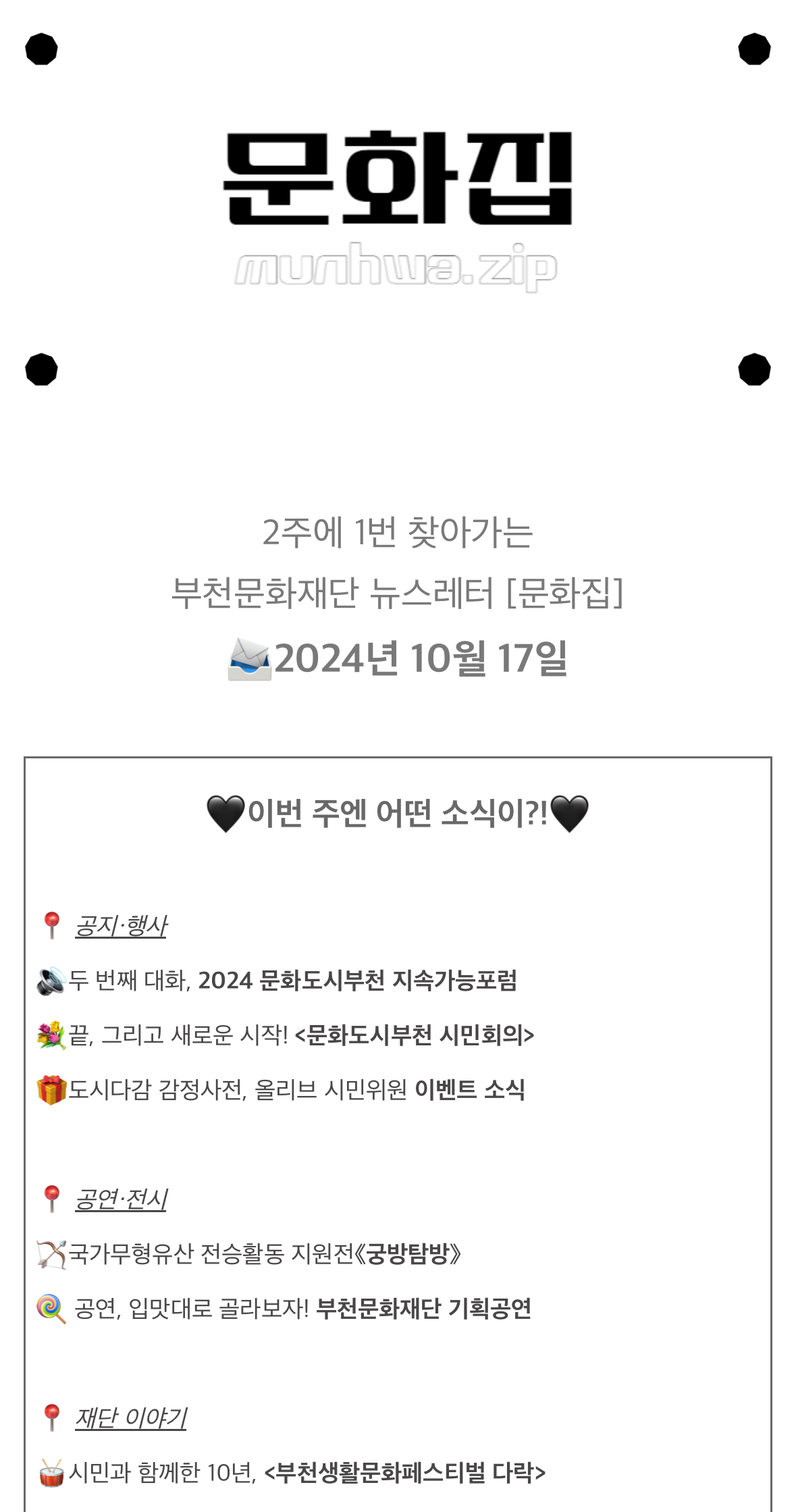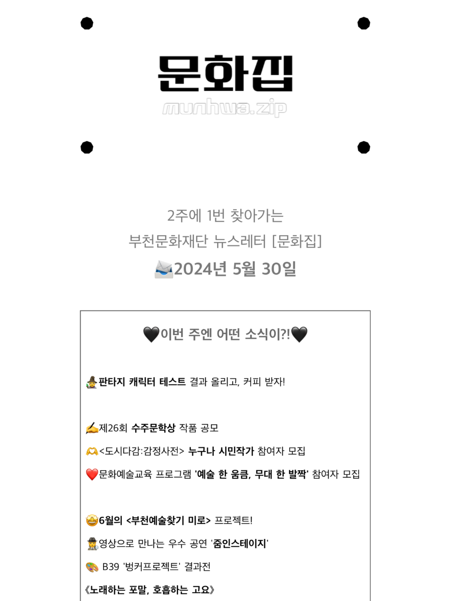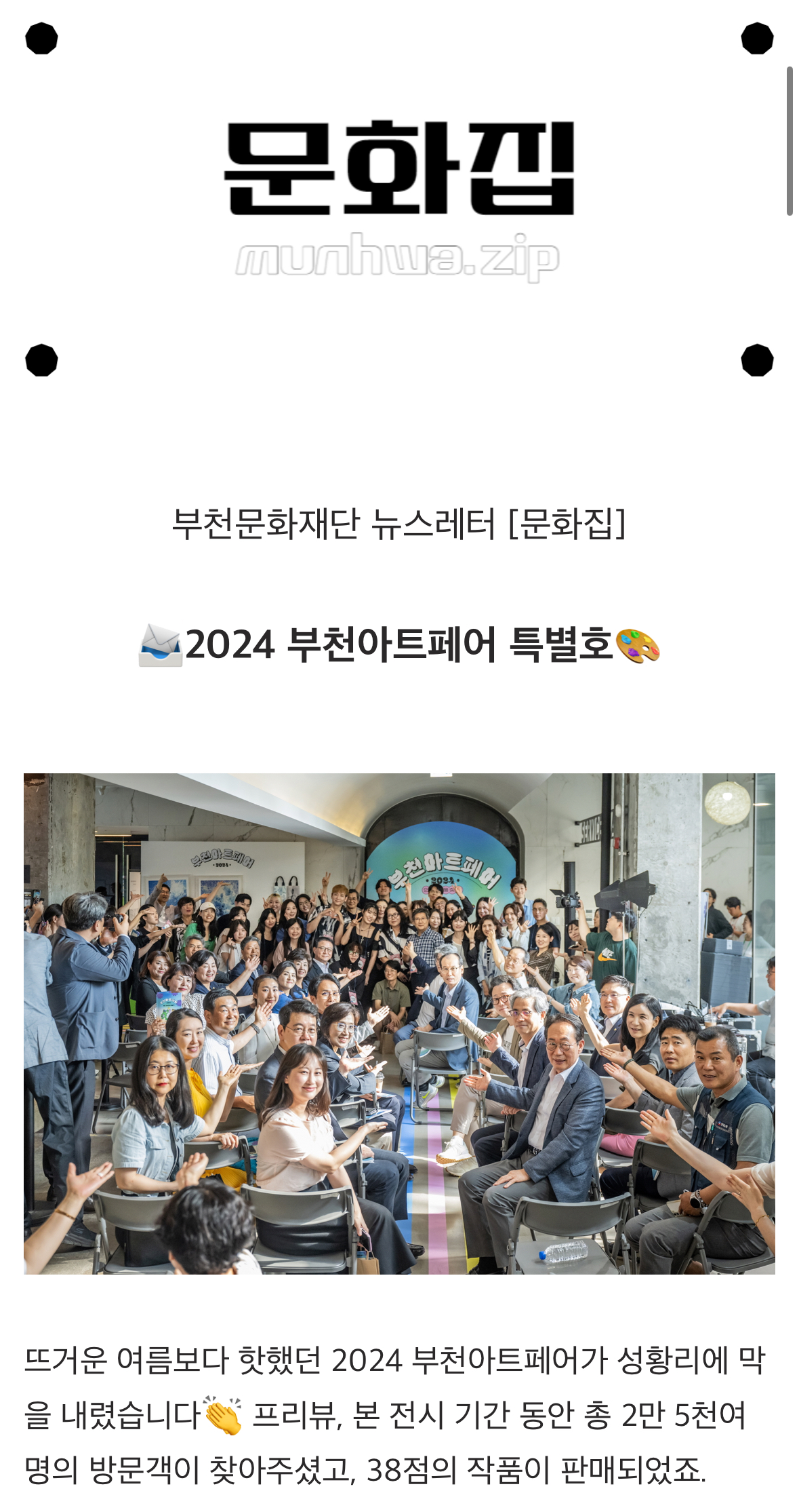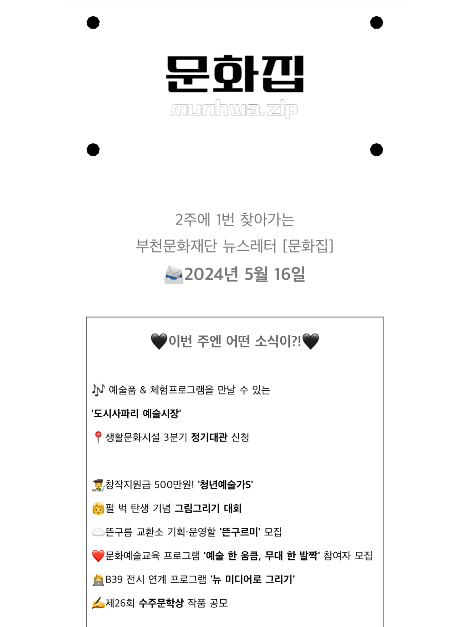 문화집 총 게시물 : 207건 전체 제목 내용 검색 조건 선택 검색어 입력 검색 문화와 함께하는 연말!⛄ 추운 겨울, 따뜻한 문화소식💌 작동, 상동, 역곡에서 만나는 예술작품👀 문화정책포럼 열려요💥 가을하면 문학!🍂 수주문학제 문화도시부천, 아주 특별한 입학식💐 벌써 열 살! 생활문화페스티벌 다락🍂 2024 부천아트페어, 비하인드 ✨大공개✨ 부천에서 열리는 역대급 축제⚡ 전시에서 공연까지! 2024 벙커페스타💥 무료 전시와 할인 소식이 가득💞 부천에선 문화로 피서 떠나요🌊 부천 곳곳이 예술로 물든다!🌸 커밍쑨! 💥2024 부천아트페어💥 7월 한여름 밤엔 재즈 공연 어때?💃 판타지아극장이 '어린이놀이터'로?😲 판타지 세계 속 나는 어떤 캐릭터?🧙 예술품 구경하며 밤산책해요🎶 수다쟁이 와글이들, ⛄눙눙이와 뭉쳤다?! 신구, 박근형 배우가 부천에 뜬다?!😲 1 2 3 4 5 6 7 8 9 10 다음페이지 마지막페이지