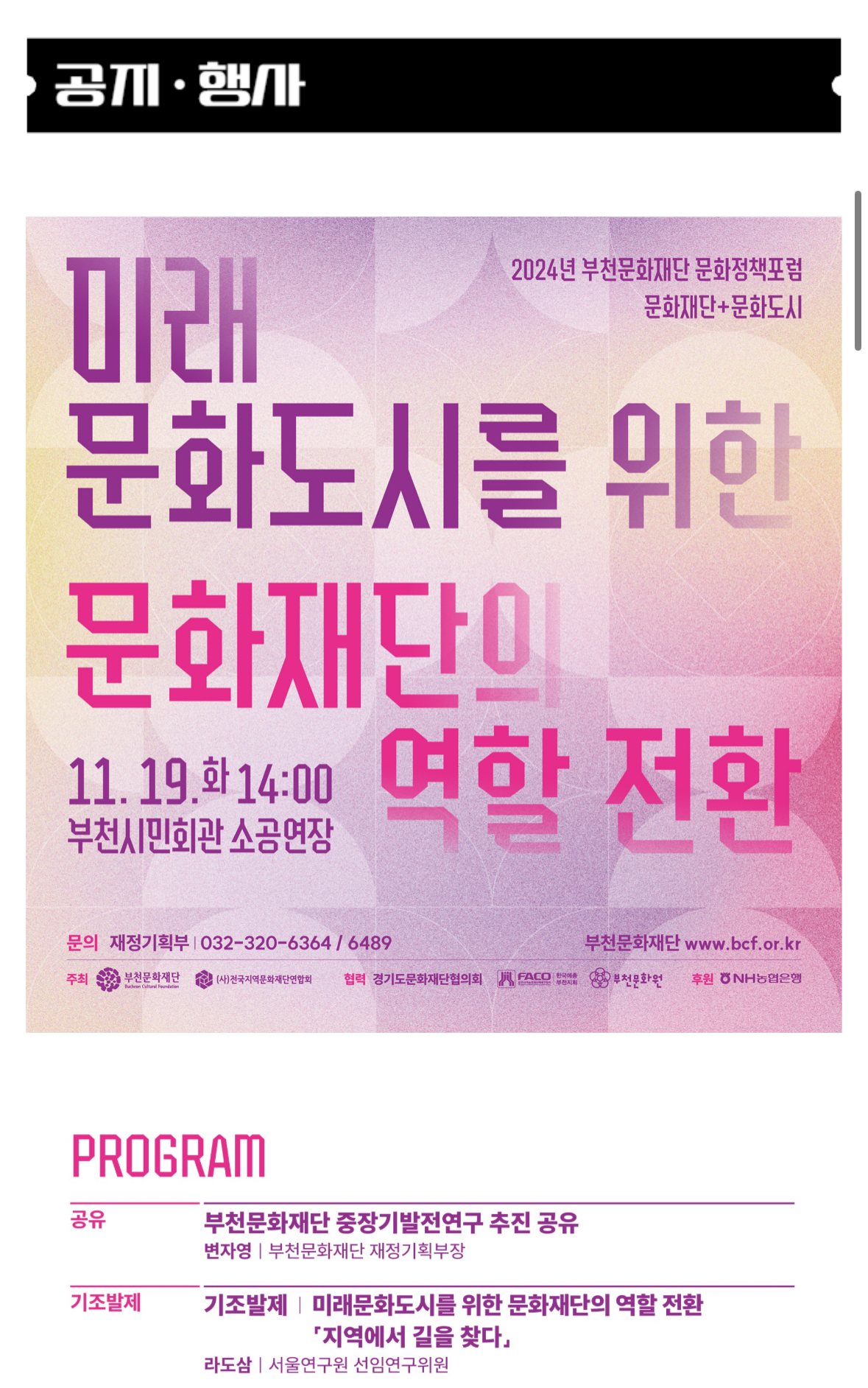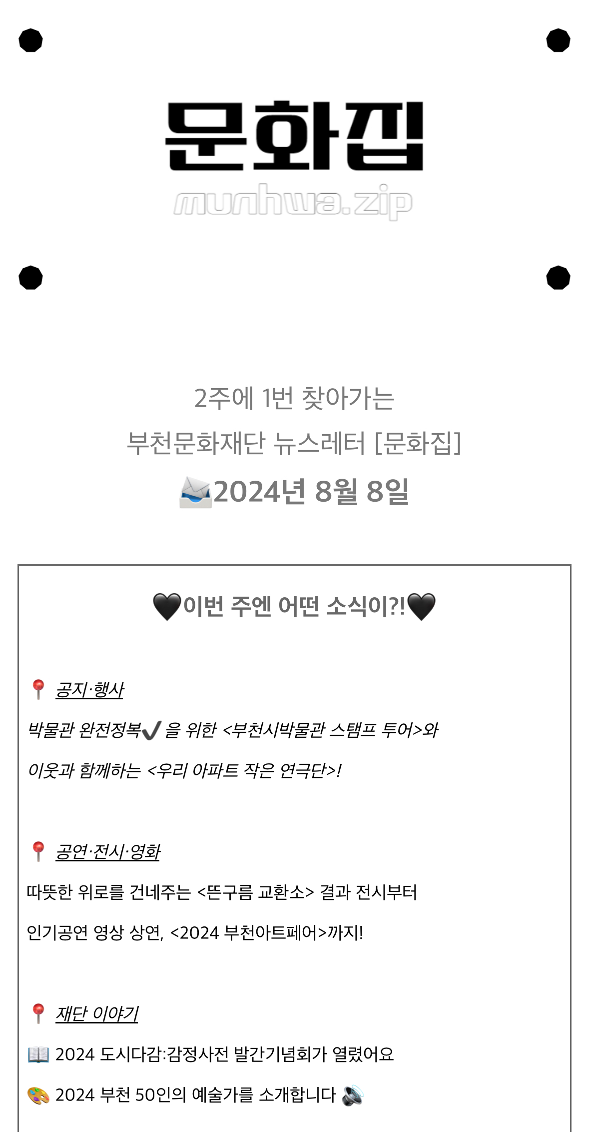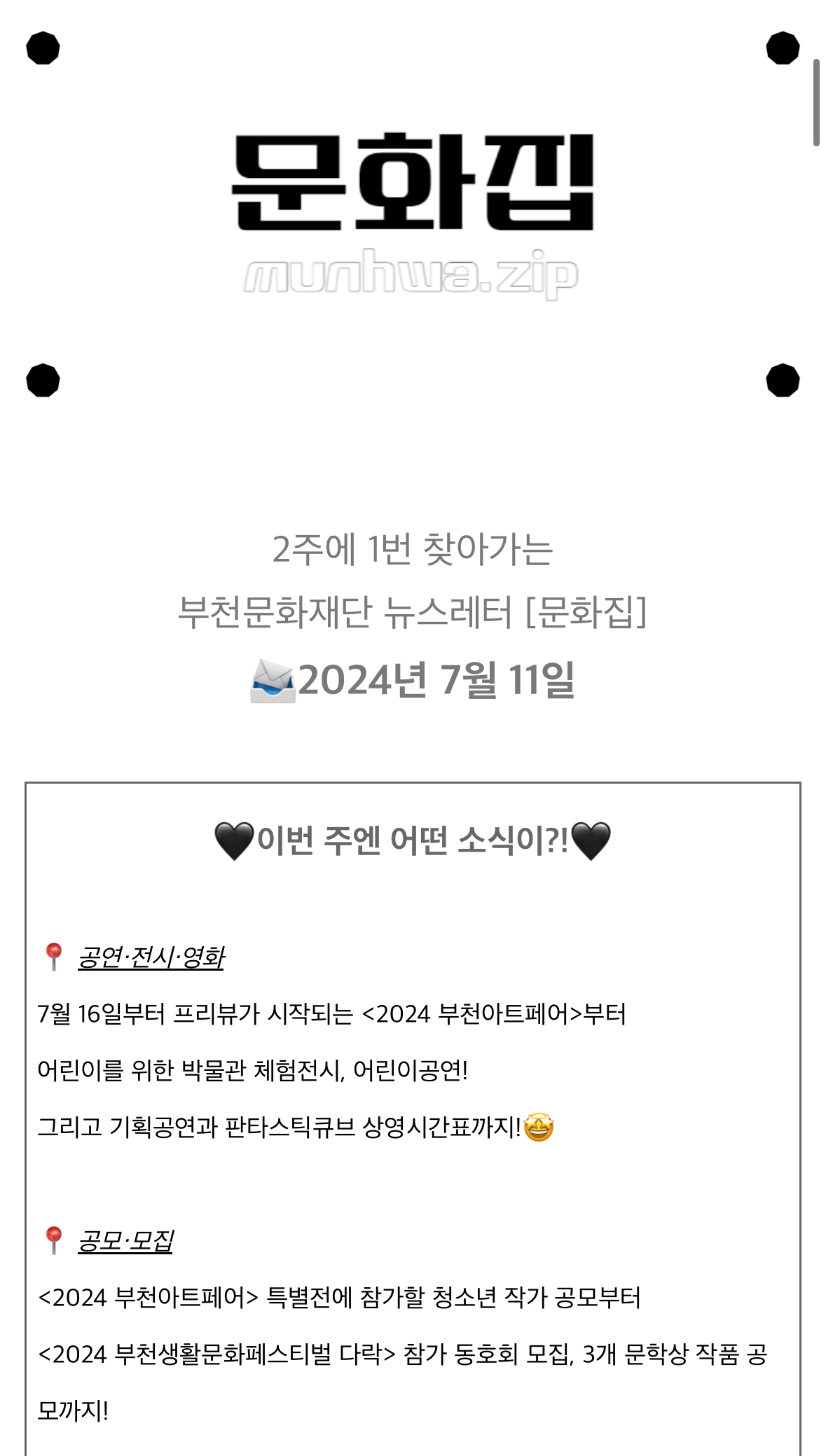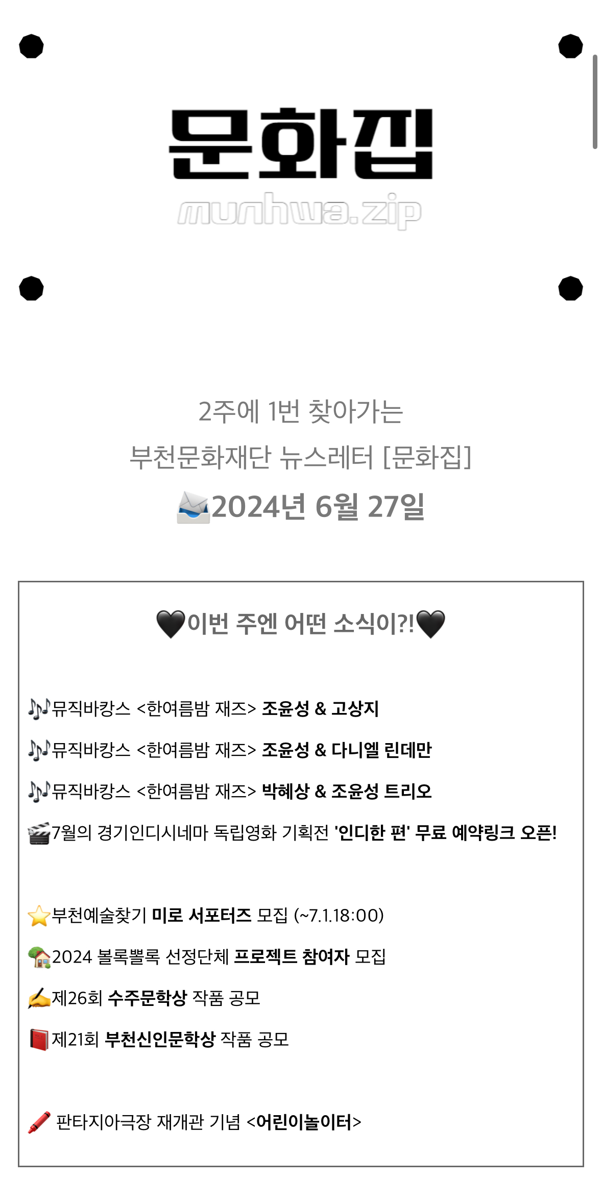 문화집 총 게시물 : 207건 전체 제목 내용 검색 조건 선택 검색어 입력 검색 문화와 함께하는 연말!⛄ 추운 겨울, 따뜻한 문화소식💌 작동, 상동, 역곡에서 만나는 예술작품👀 문화정책포럼 열려요💥 가을하면 문학!🍂 수주문학제 문화도시부천, 아주 특별한 입학식💐 벌써 열 살! 생활문화페스티벌 다락🍂 2024 부천아트페어, 비하인드 ✨大공개✨ 부천에서 열리는 역대급 축제⚡ 전시에서 공연까지! 2024 벙커페스타💥 무료 전시와 할인 소식이 가득💞 부천에선 문화로 피서 떠나요🌊 부천 곳곳이 예술로 물든다!🌸 커밍쑨! 💥2024 부천아트페어💥 7월 한여름 밤엔 재즈 공연 어때?💃 판타지아극장이 '어린이놀이터'로?😲 판타지 세계 속 나는 어떤 캐릭터?🧙 예술품 구경하며 밤산책해요🎶 수다쟁이 와글이들, ⛄눙눙이와 뭉쳤다?! 신구, 박근형 배우가 부천에 뜬다?!😲 1 2 3 4 5 6 7 8 9 10 다음페이지 마지막페이지