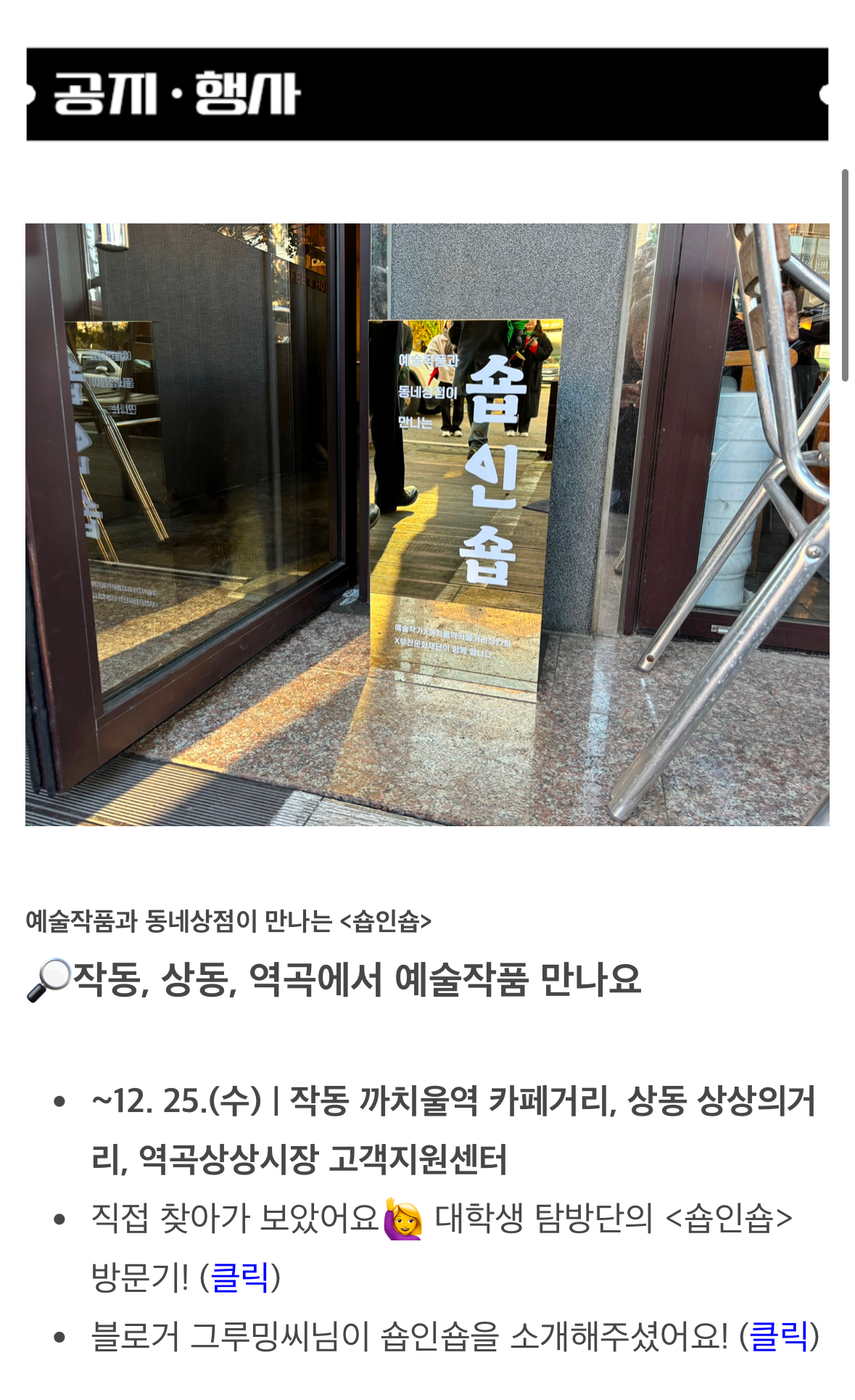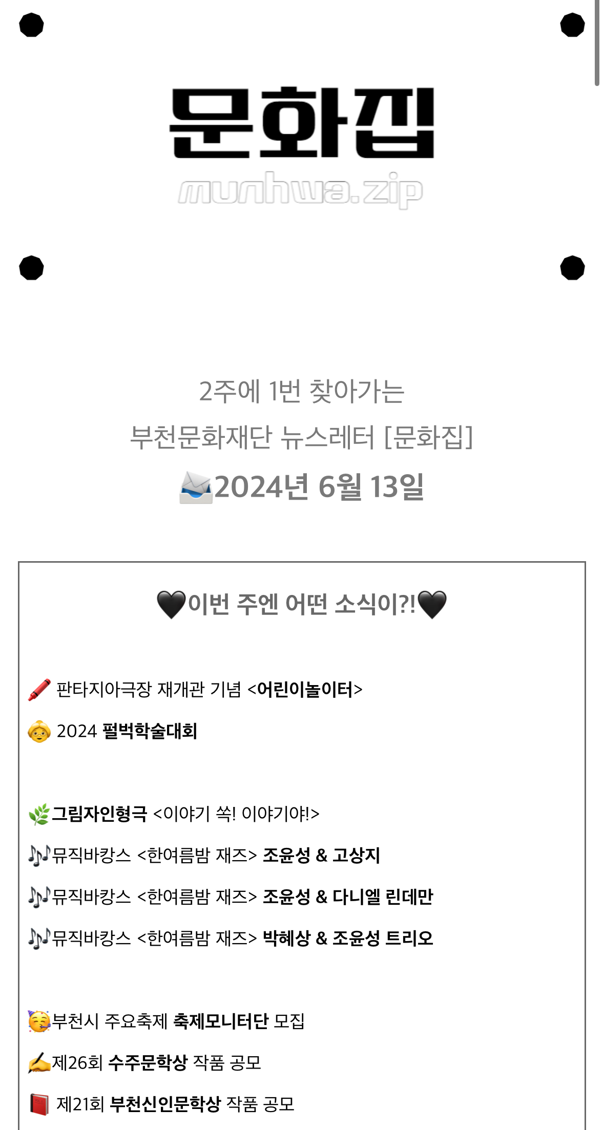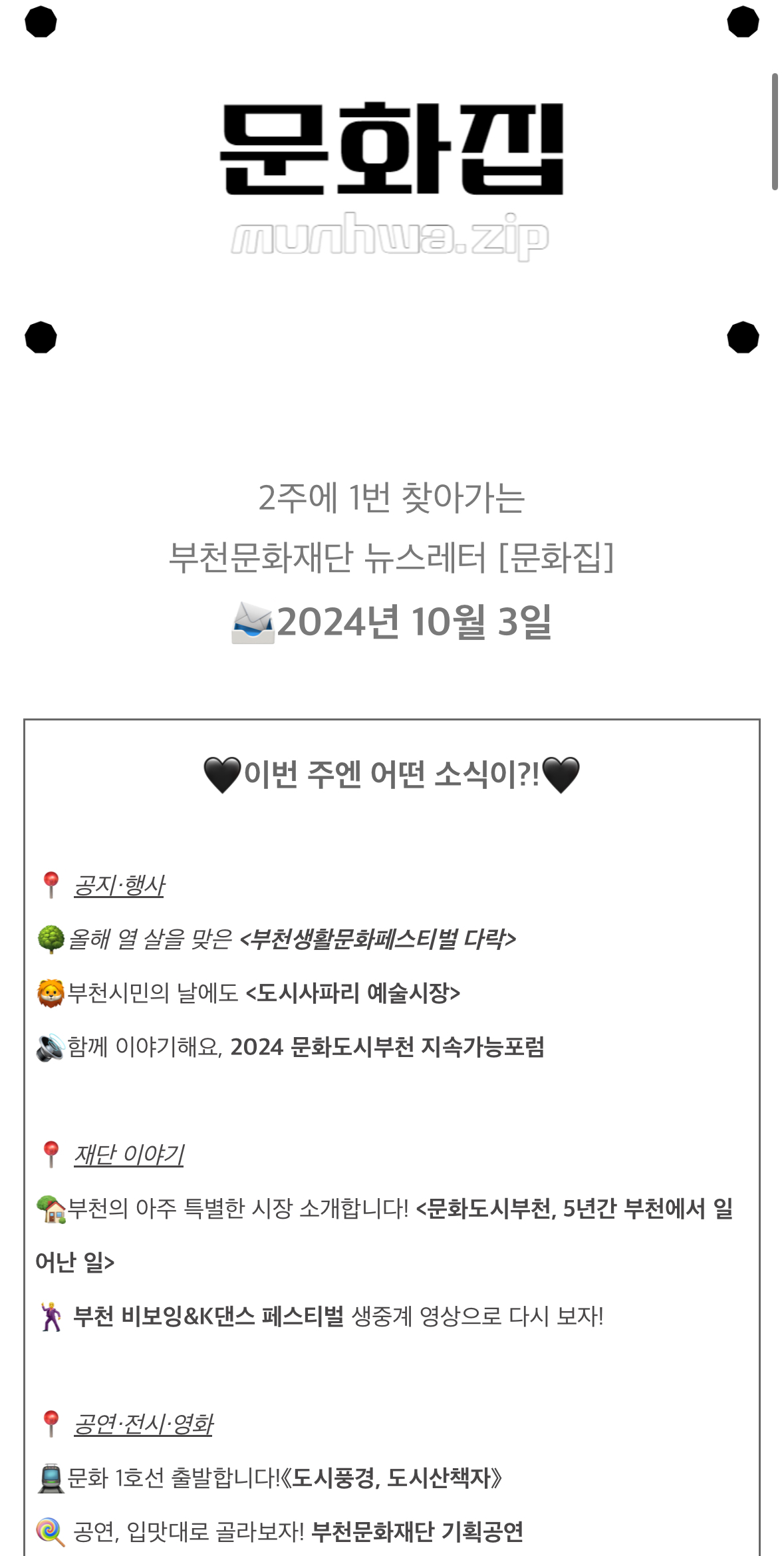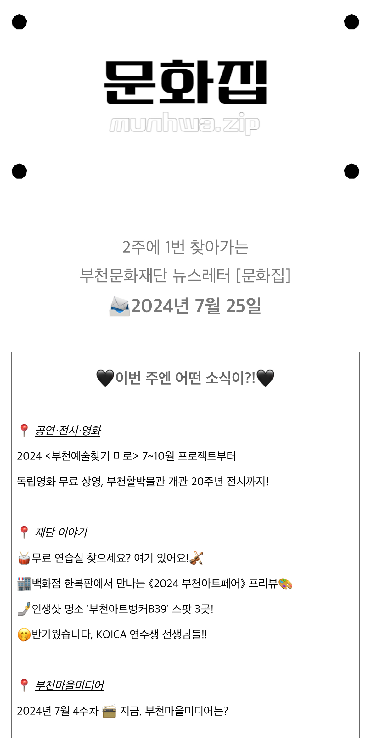 문화집 총 게시물 : 207건 전체 제목 내용 검색 조건 선택 검색어 입력 검색 문화와 함께하는 연말!⛄ 추운 겨울, 따뜻한 문화소식💌 작동, 상동, 역곡에서 만나는 예술작품👀 문화정책포럼 열려요💥 가을하면 문학!🍂 수주문학제 문화도시부천, 아주 특별한 입학식💐 벌써 열 살! 생활문화페스티벌 다락🍂 2024 부천아트페어, 비하인드 ✨大공개✨ 부천에서 열리는 역대급 축제⚡ 전시에서 공연까지! 2024 벙커페스타💥 무료 전시와 할인 소식이 가득💞 부천에선 문화로 피서 떠나요🌊 부천 곳곳이 예술로 물든다!🌸 커밍쑨! 💥2024 부천아트페어💥 7월 한여름 밤엔 재즈 공연 어때?💃 판타지아극장이 '어린이놀이터'로?😲 판타지 세계 속 나는 어떤 캐릭터?🧙 예술품 구경하며 밤산책해요🎶 수다쟁이 와글이들, ⛄눙눙이와 뭉쳤다?! 신구, 박근형 배우가 부천에 뜬다?!😲 1 2 3 4 5 6 7 8 9 10 다음페이지 마지막페이지