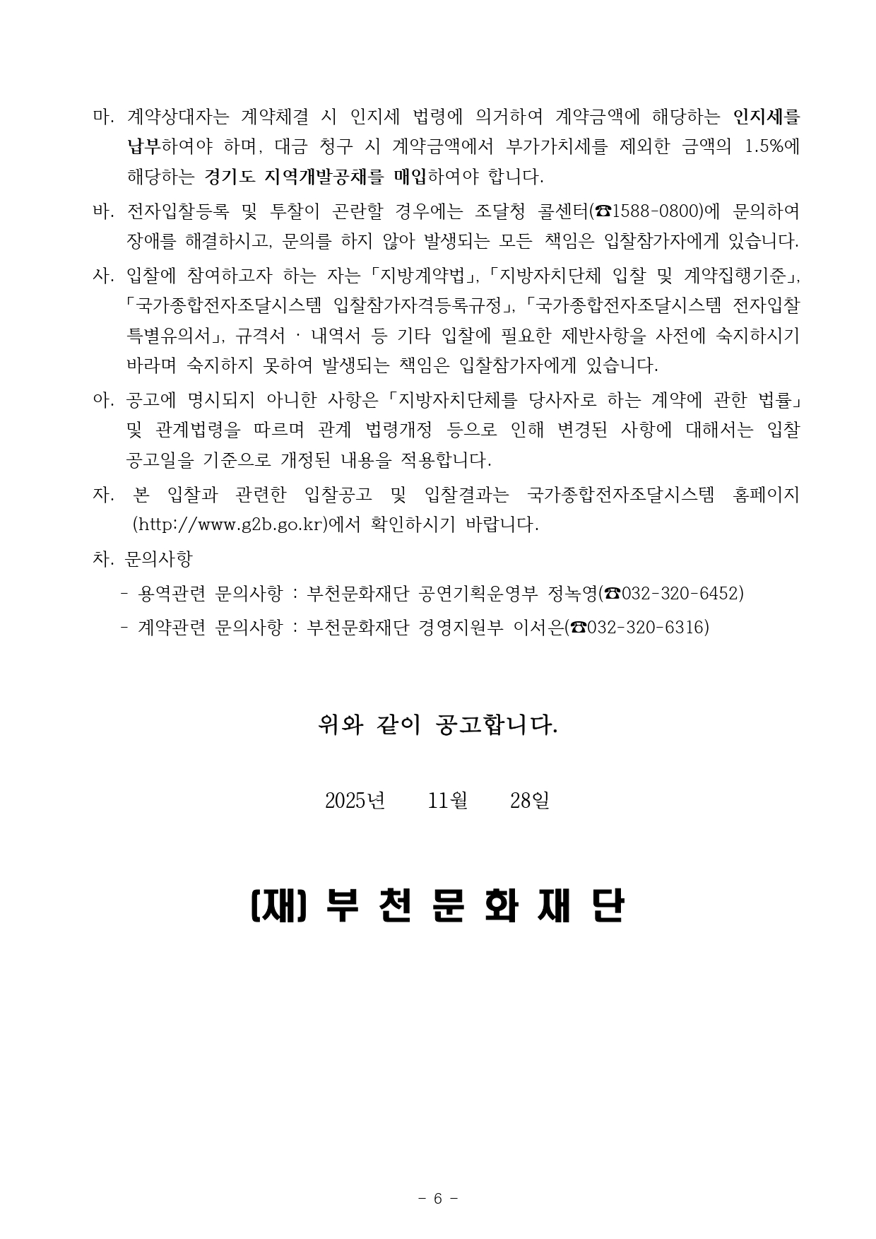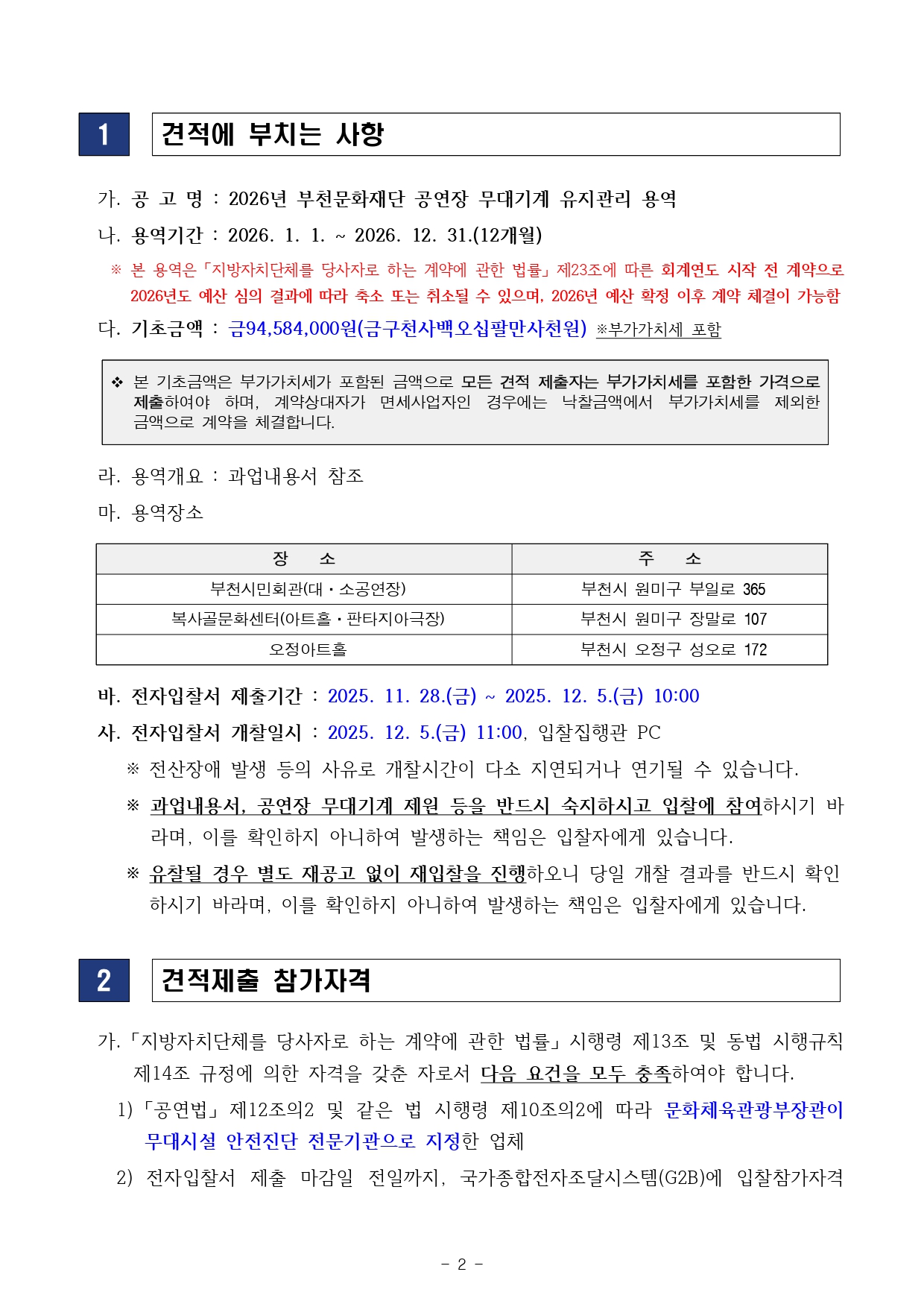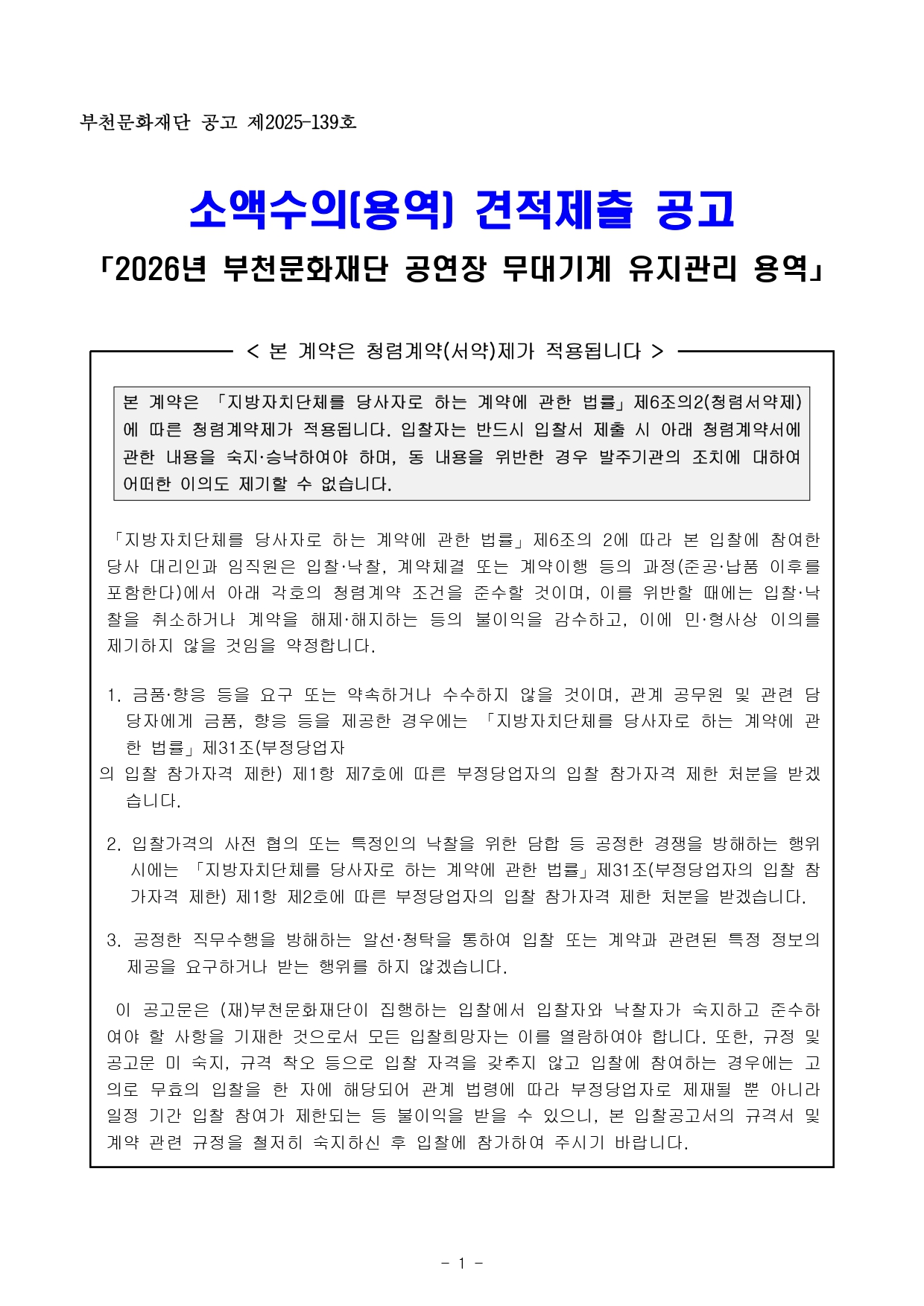 [공고 제2025-139호] 2026년 부천문화재단 공연장 무대기계 유지관리 용역(소액수의 견적제출_2인이상(용역)) 구분 작성자 경영지원부 작성일 2025.11.28 조회수 15 파일 입찰공고문_소액수의(용역) 견적제출_2026년 부천문화재단 공연장 무대기계 유지관리 용역.hwp 다운로드 과업내용서_2026년 부천문화재단 공연장 무대기계 유지관리 용역.hwp 다운로드 공연장 무대기계 제원_2026년 부천문화재단 공연장 무대기계 유지관리 용역.xls 다운로드 목록 이전 글 [공고 제2025-117호] 복사골아트홀 산업용 리프트 구매설치(소액수의 견적제출_2인이상(물품))