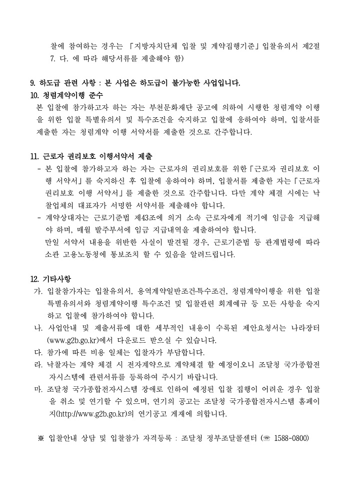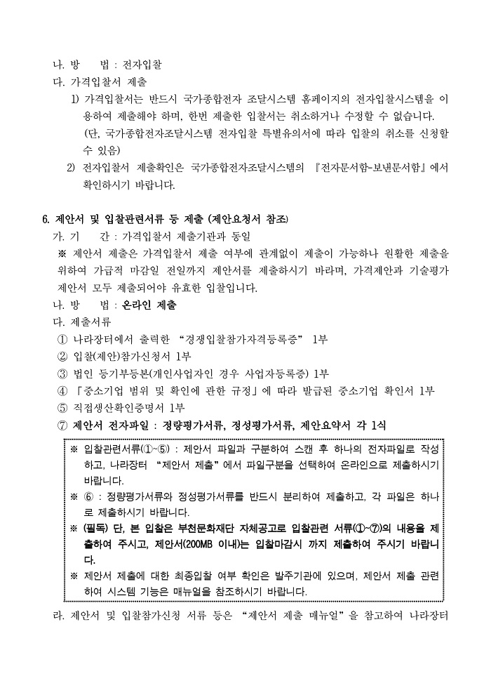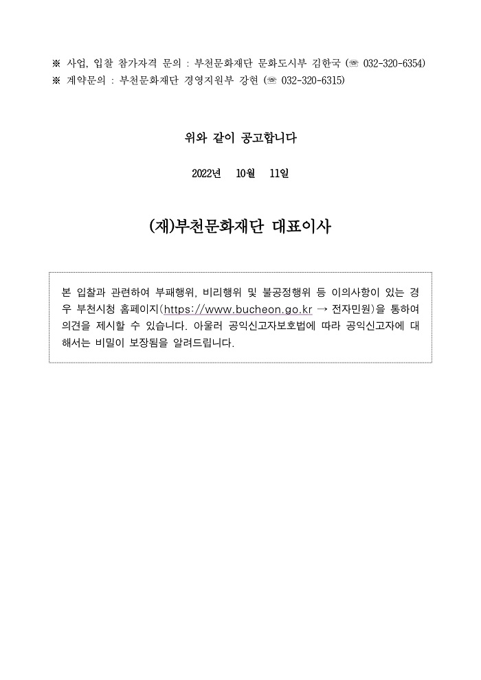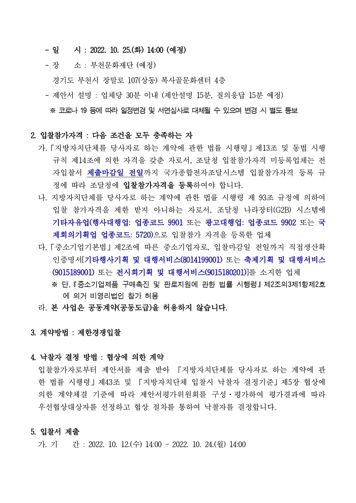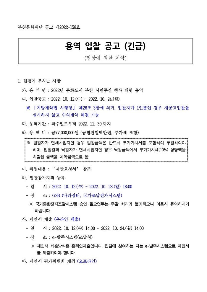 [공고 제2022-158호] 2022년 문화도시 부천 시민주간 행사 대행 용역 (협상에 의한 계약) 구분 작성자 작성일 2022.10.11 조회수 파일 제안요청서_2022년 문화도시 부천 시민주간.hwp 다운로드 제안요청서_2022년 문화도시 부천 시민주간.pdf 다운로드 제안요청서_2022년 문화도시 부천 시민주간.hwp 다운로드 목록 [공고 제2022-159호] 2022년 스마트 부천시박물관 구축지원사업 용역 (협상에 의한 계약) 다음글