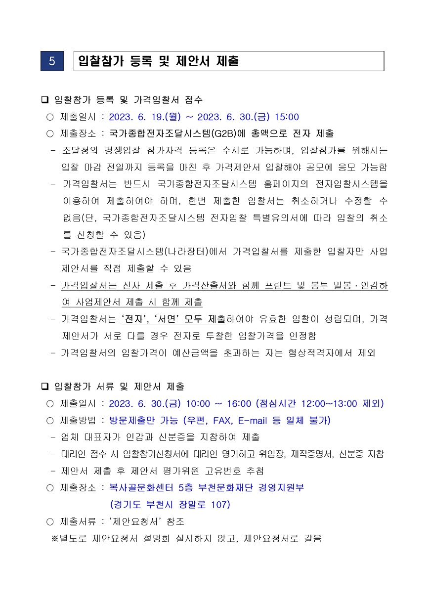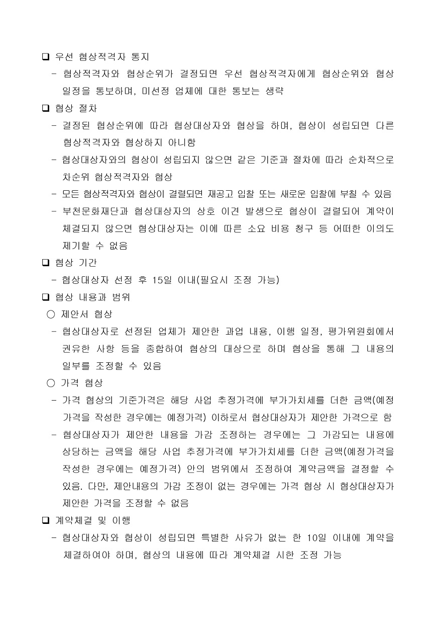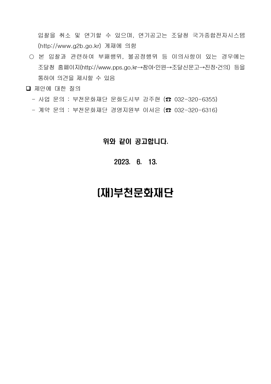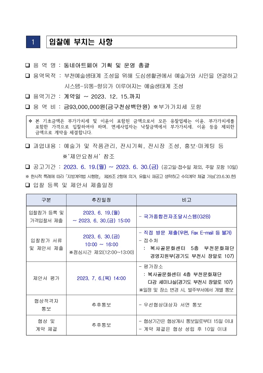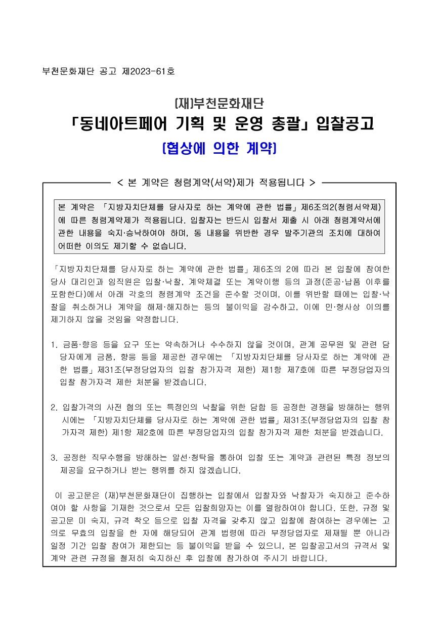 [공고 제2023-61호] 동네아트페어 기획 및 운영 총괄 (협상에 의한 계약) 구분 작성자 작성일 2023.06.19 조회수 파일 [입찰공고문] 동네아트페어 기획 및 운영 총괄_(재)부천문화재단.hwp 다운로드 [제안요청서] 동네아트페어 기획 및 운영 총괄_(재)부천문화재단.hwp 다운로드 목록 이전 글 [공고 제2022-159호] 2022년 스마트 부천시박물관 구축지원사업 용역 (협상에 의한 계약) [공고 제2023-73호] 2023년 부천시승격 50주년 특별전 공간조성(기획, 제작설치) 용역 (협상에 의한 계약) 다음글