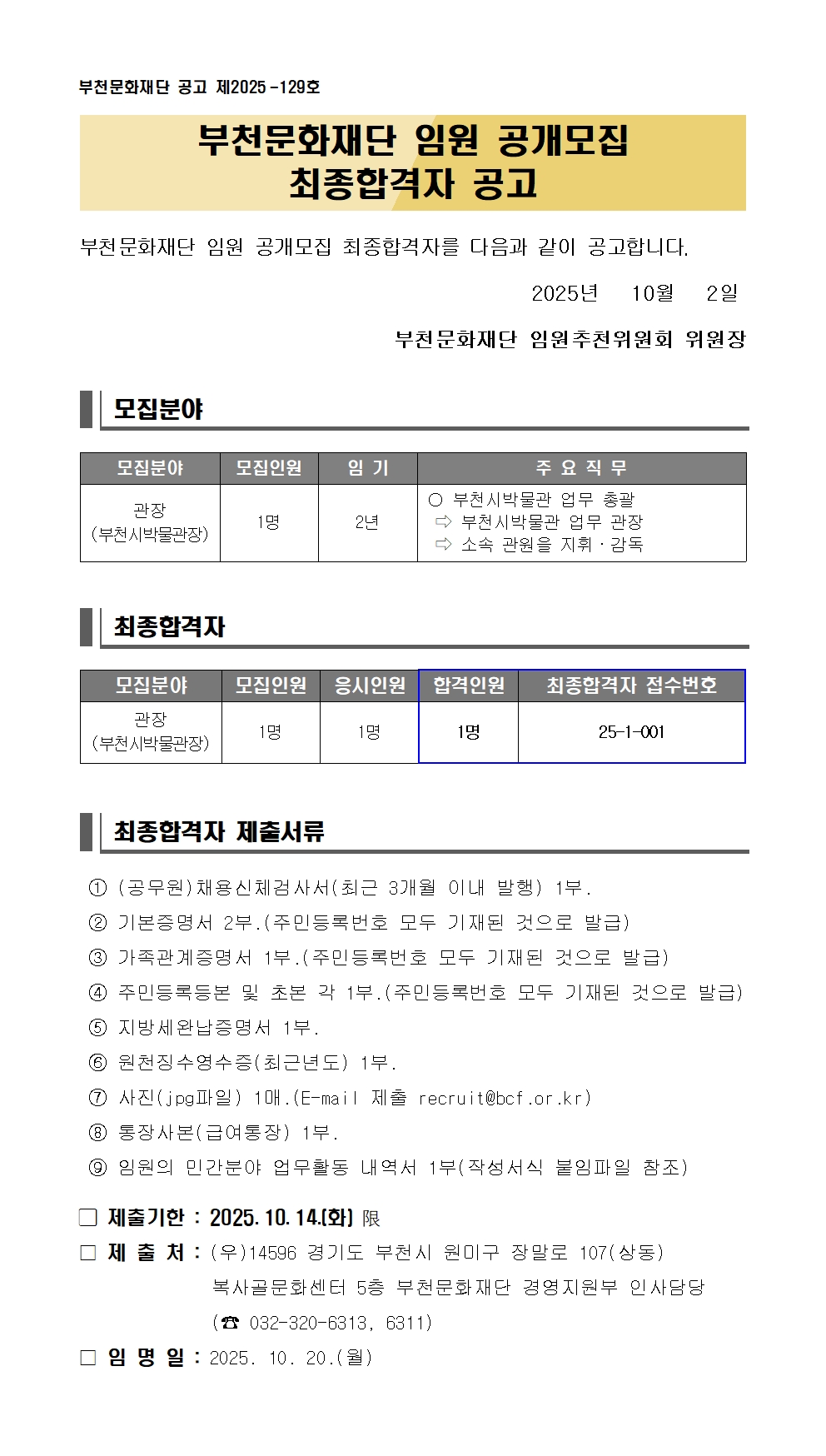 [공고 제2025-129호] 부천문화재단 임원 공개모집 최종합격자 공고 구분 채용 작성자 경영지원부 작성일 2025.10.02 조회수 2596 파일 [공고 제2025-129호] 부천문화재단 임원 공개모집 최종합격자_공고문.pdf 다운로드 [서식] 임원의 민간분야 업무활동내역서.hwp 다운로드 목록 이전 글 2025 부천 시민미디어 페스티벌 영상 공모전 당선작 결과 발표 부천공연예술연습공간 역량강화프로그램 <예술가를 위한 소매틱 치유 워크숍 - 오롯이, 나로서> 참여자 모집안내 다음글