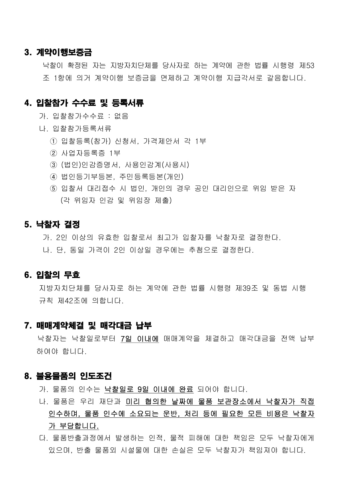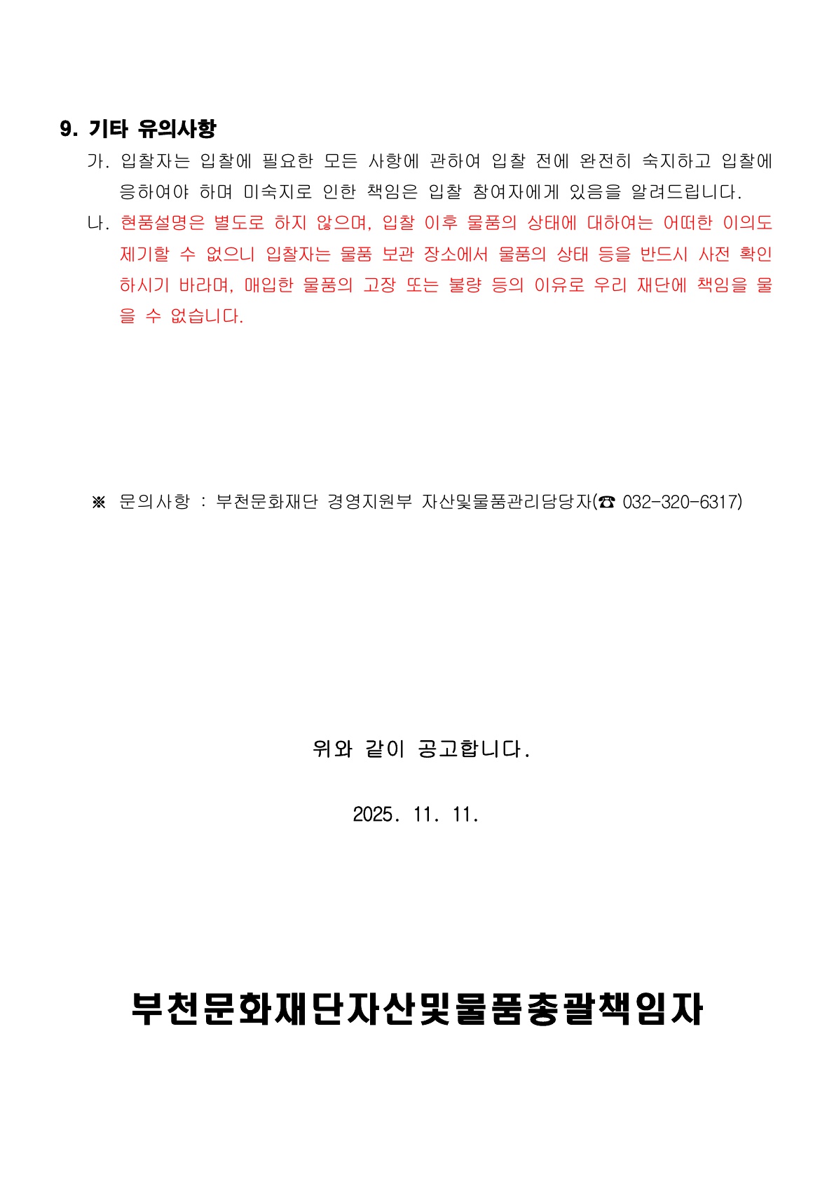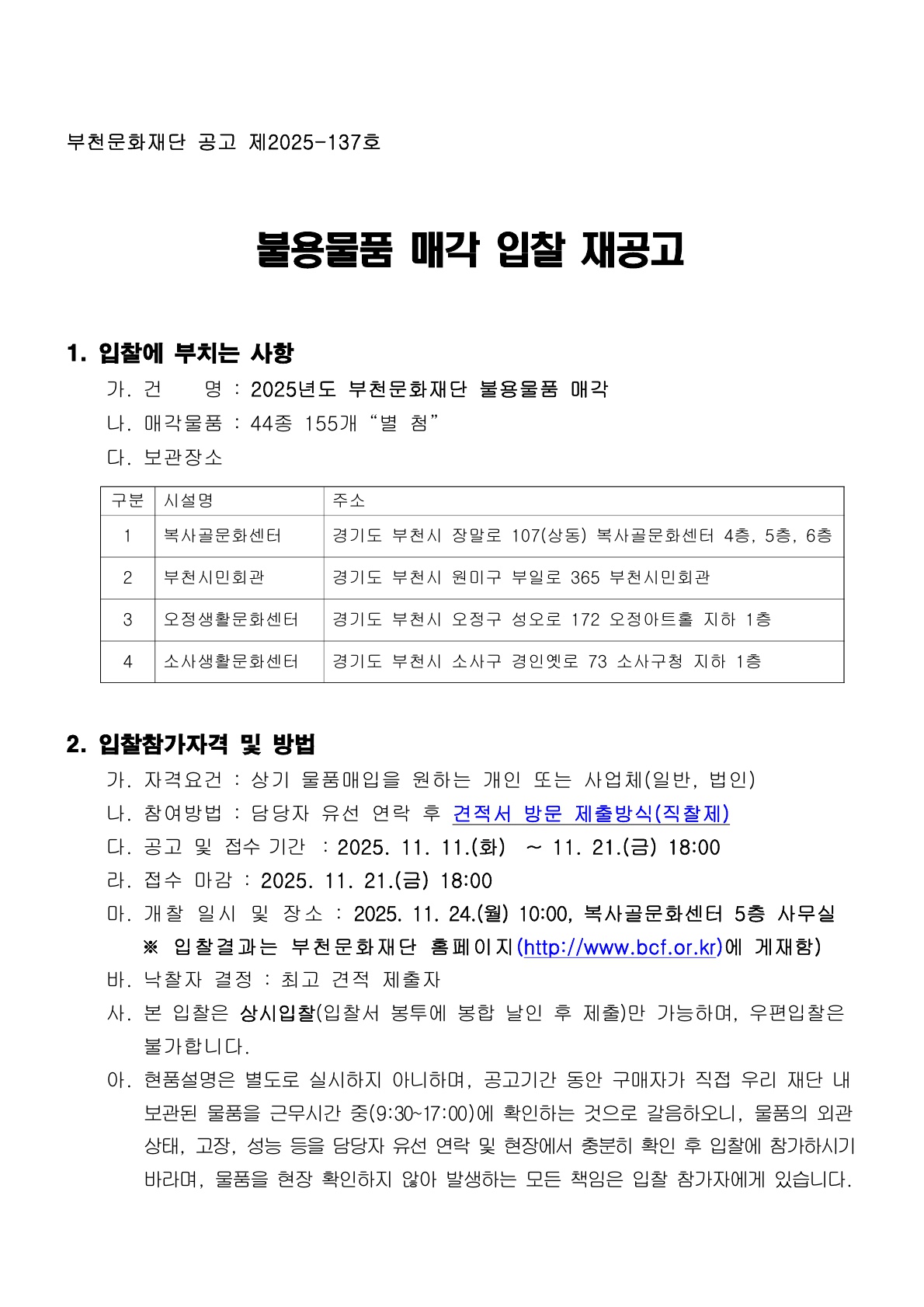 [공고 제2025-137호] 2025년 부천문화재단 불용물품 매각 재공고 구분 입찰 작성자 경영지원부 작성일 2025.11.11 조회수 5986 파일 (붙임1)입찰등록(참가)신청서, 가격제안서(25.11.11.).hwp 다운로드 (붙임2)2025년 부천문화재단 매각대상 목록 및 사진.pdf 다운로드 목록 이전 글 [공고 제 2025-136호] 2026년 1분기 [1월~3월] 부천문화재단 생활문화시설 정기대관 신청 안내 [부천문화특화구역] 참여작가 연합프로젝트 안내 다음글