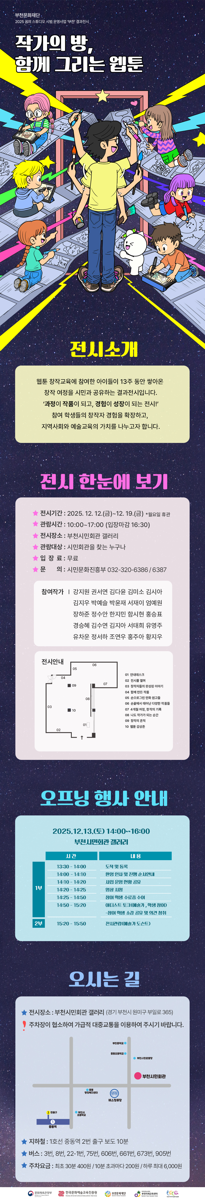 2025 꿈의 스튜디오 시범 운영사업 '부천' 결과전시 <작가의 방, 함께 그리는 웹툰> 구분 행사 작성자 시민문화진흥부 작성일 2025.12.04 조회수 2572 파일 [포스터] 2025 꿈의 스튜디오 시범 운영사업 '부천' 결과전시 작가의 방, 함께 그리는 웹툰.jpg 다운로드 [초대장] 2025 꿈의 스튜디오 시범 운영사업 '부천' 결과전시 작가의 방, 함께 그리는 웹툰.jpg 다운로드 목록 이전 글 '2025 내일의예술가'와 함께하는 드로잉 워크숍 <기억구름으로 그리는 내 안의 부천> [주말체험행사 안내] 문화특화구역 특별전시 <메이드인부천모음집.zip :: 확장판> 다음글