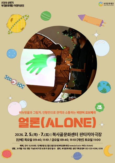 2026년 부천문화재단 상반기 어린이공연 <얼론(ALONE)> 티켓 오픈 구분 공연 작성자 공연기획운영부 작성일 2025.12.15 조회수 91 ▶ (개인) 12월 16일(화) 오후2시 티켓 오픈(클릭!) ▶ (단체) 12월 17일(수) 오후2시 10인 이상 단체예매 오픈(클릭!) 파일 목록 이전 글 부천문화재단 지역 장애예술인 공동기획전시 <열린시선, 이어진 예술> 크리스마스&2026년 1월 1일 재단 공간 운영 안내 다음글