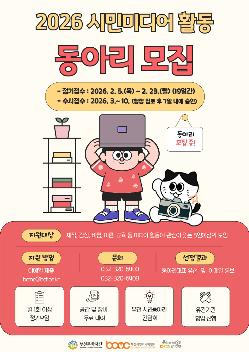 2026 시민미디어활동 동아리 모집 구분 모집 작성자 시민문화진흥부 작성일 2026.02.04 조회수 17044 파일 붙임1.미디어동아리 회원 명단.hwp 다운로드 붙임2.미디어동아리 활동 보고서.hwp 다운로드 붙임3.미디어동아리 활동지원 신청서.hwp 다운로드 목록 이전 글 2026년 부천시 협력기관 직원 통합채용시험 변경 사전예고 [공고 제2026-010호] 2026 부천문화재단 부천공연예술연습공간 단시간(시간제)근로자 채용 면접일정 공고 다음글