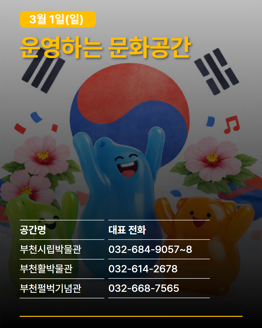 2026 삼일절 재단 공간 운영 안내 구분 발표 작성자 부천문화재단 작성일 2026.02.25 조회수 9205 삼일절 재단 공간 운영 안내 1919년 3월 1일,대한독립을 외쳤던 그날의 의미를 되새기며삼일절 재단 공간 운영 안내드립니다🔔 📌3월 1일(일) 운영 공간: 부천시립박물관 부천활박물관 부천펄벅기념관 📌3월 2일(월): 전체 휴무 파일 목록 이전 글 [공고 제2026-021호] 2026 부천악기은행 단시간(시간제)근로자 채용 공고 [공고 제2026-022호] 2026년도 제1회 부천문화재단 공개채용(기간제근로자) 최종합격자 공고 다음글