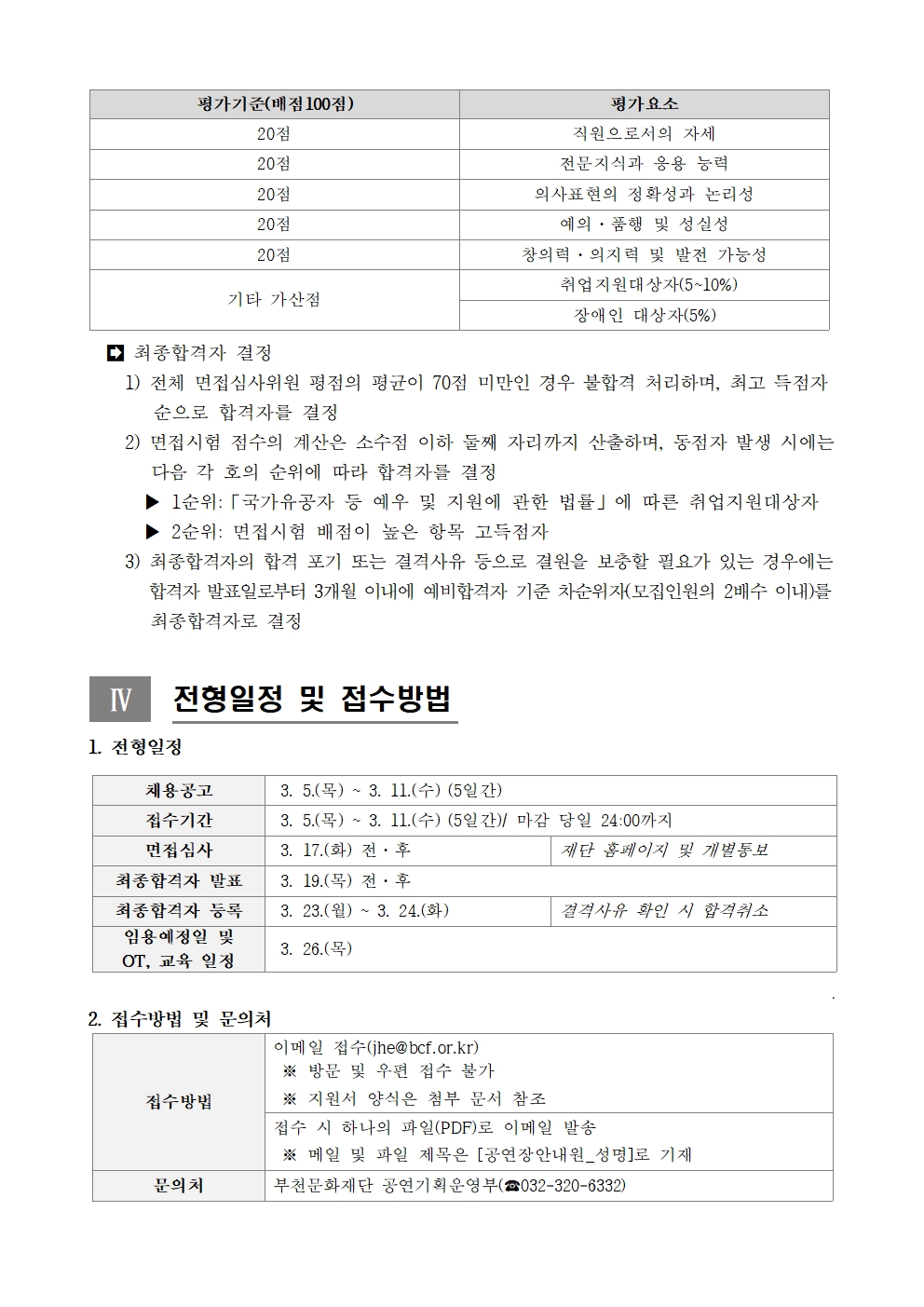 [공고 제 2026-024호] 2026 부천문화재단 시간제근로자(공연장안내원) 재공고 채용 모집 공고 구분 채용 작성자 공연기획운영부 작성일 2026.03.05 조회수 10228 파일 붙임1. 공고문(안).pdf 다운로드 붙임2. 입사지원서(개인정보제공동의서) 서식.hwp 다운로드 붙임3. 채용서류 반환청구서..hwp 다운로드 목록 이전 글 [공고 제2026-023호] 「2026 문화정책협의체-시민랩」 모집 공고 [공고 제2026-025호] 「2026 문화정책협의체-정책자문단」 모집 공고(~3.23) 다음글