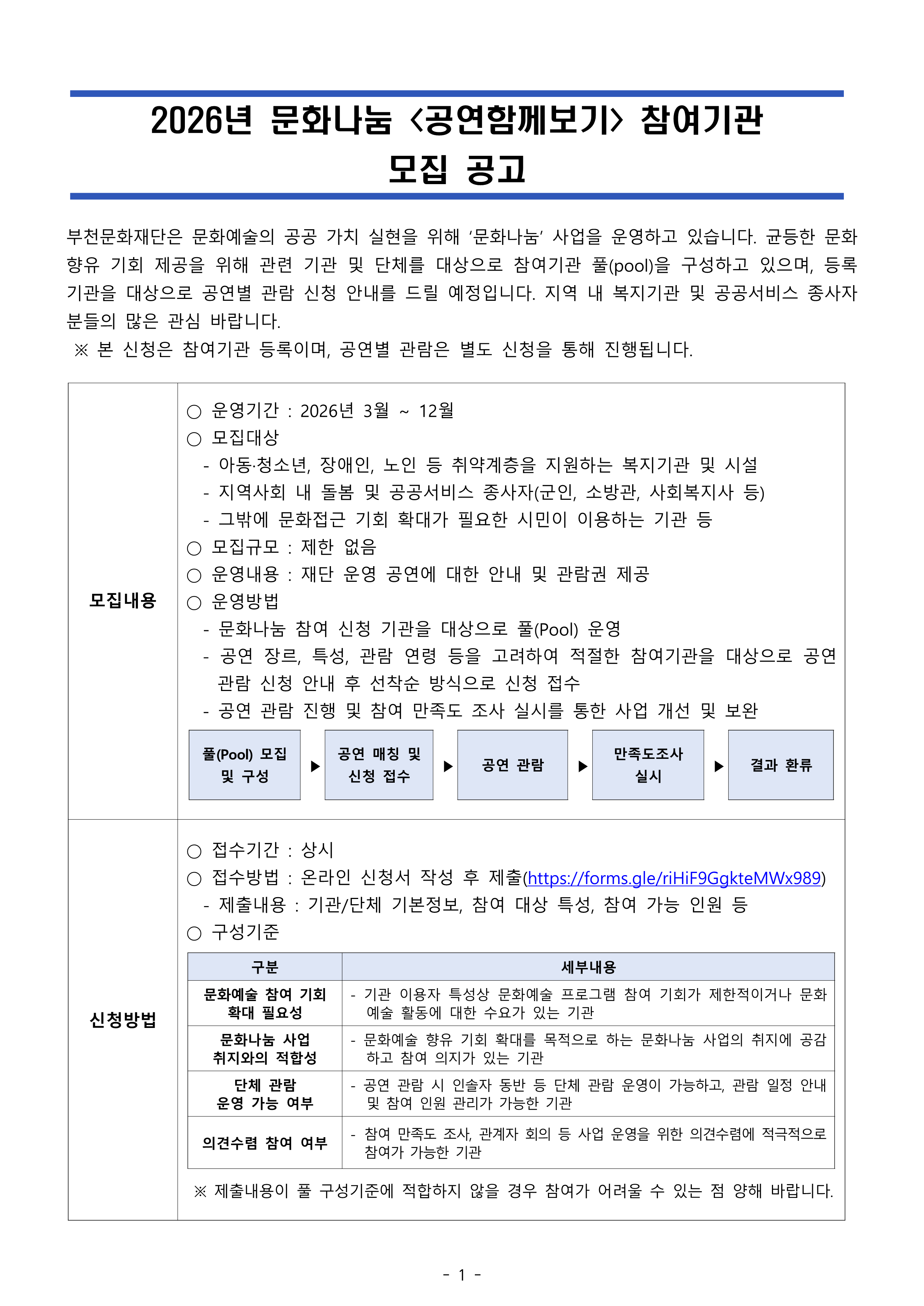 [공고 제2026-34호] 2026년 문화나눔 <공연함께보기> 참여기관 모집 공고 구분 모집 작성자 공연기획운영부 작성일 2026.03.20 조회수 5503 >>온라인 신청서 바로가기 (클릭)<< 파일 2026년 문화나눔 참여기관 모집 공고.pdf 다운로드 목록 이전 글 [공고 제2026-32호] 부천문화재단 공연장 안내원(시간제근로자) 5기 최종합격자 공고 2026 지역영상인력 제작지원사업 <부천 필름메이커스> 모집 공고 다음글