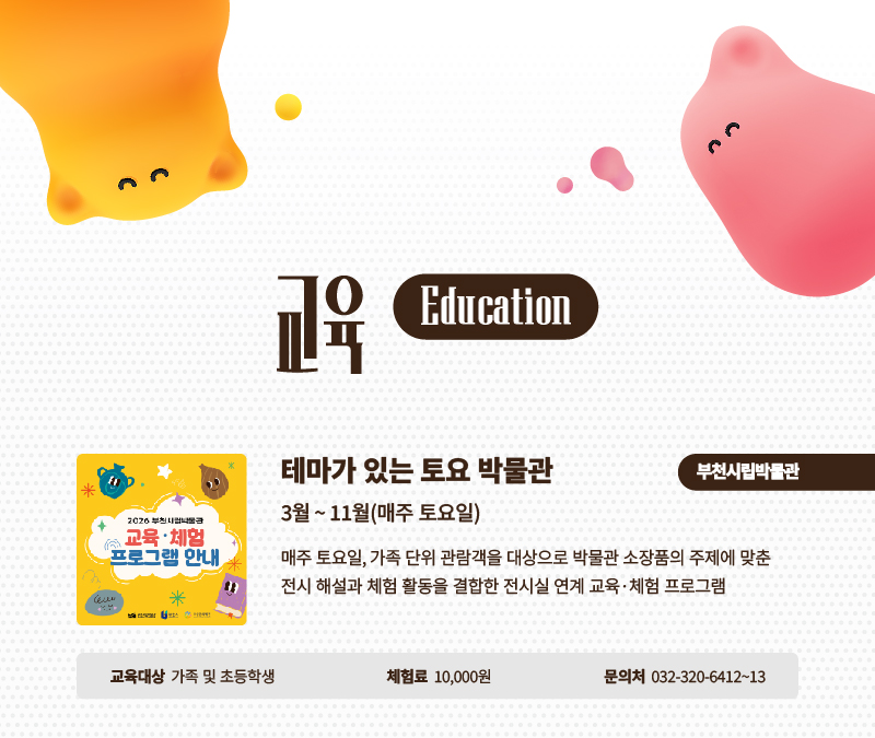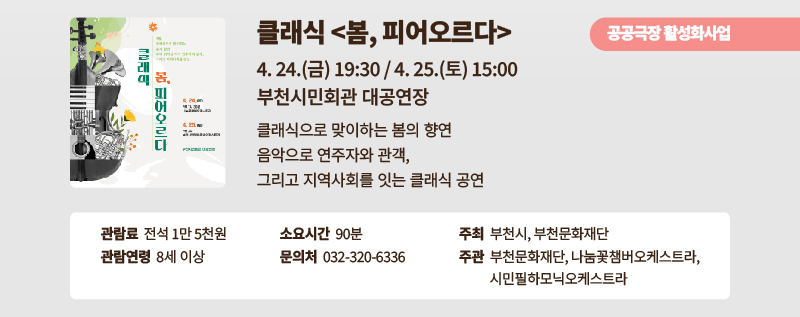 🌼2026 부천문화재단 봄시즌 프로그램 안내🌼 구분 작성자 부천문화재단 작성일 2026.03.26 조회수 2711 *해당 이미지를 누르시면 관련 페이지 링크로 이동합니다.**링크된 페이지가 나타나지 않는 경우, 예매/접수 개시 전 사업입니다. 예매/접수 일정 문의는 각 사업별 담당 문의처로 부탁드립니다. 파일 목록 이전 글 🎉부천악기은행 개소식 안내 🎶 악기를 빌리고, 문화를 나누는 부천악기은행! 소사생활문화센터 운영 안내 (3. 28. 토요일 오전 정상운영) 다음글