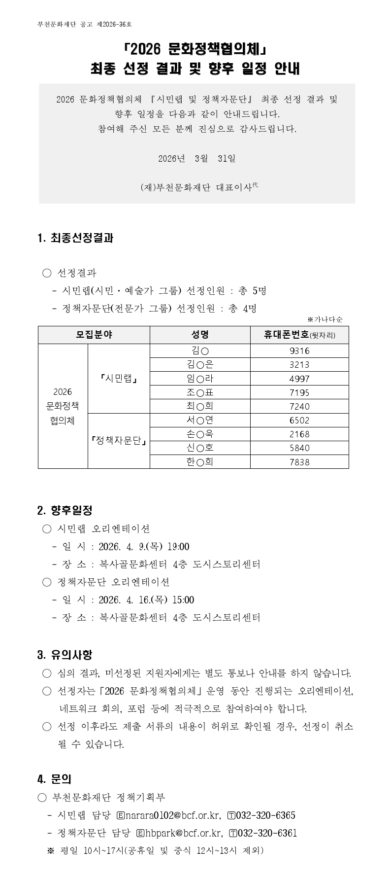 [공고 제2026-36호] 「2026 문화정책협의체」최종 선정 결과 및 향후 일정 안내 구분 발표 작성자 정책기획부 작성일 2026.03.31 조회수 473 파일 목록 이전 글 [중요] 재단 임직원 사칭 사기피해 주의 안내(2026.3.)