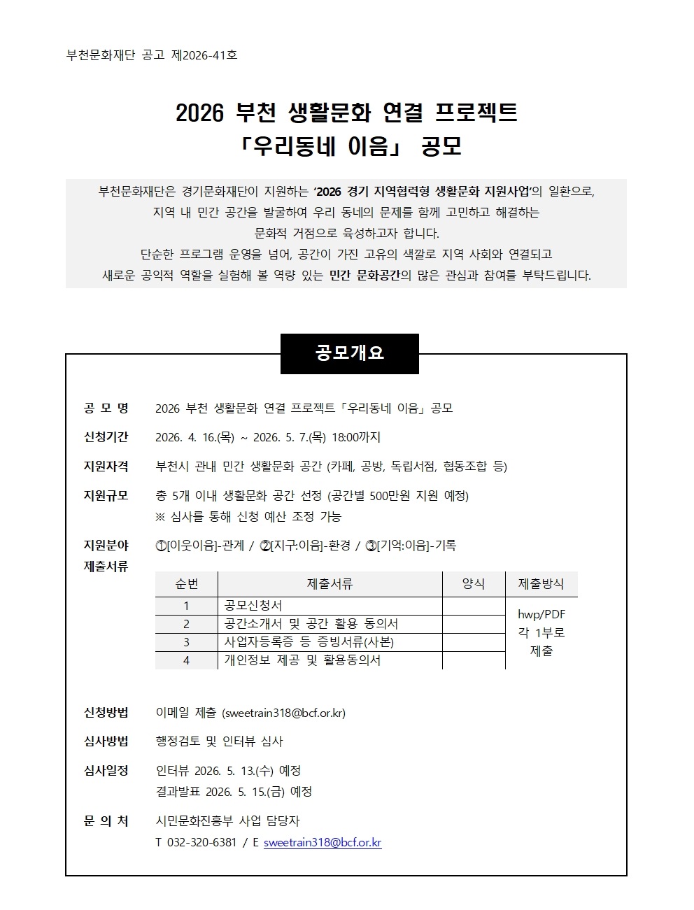[공고 제2026-41호] 2026 부천 생활문화 연결 프로젝트 우리동네 이음 공모 구분 모집 작성자 시민문화진흥부 작성일 2026.04.15 조회수 526 파일 1. 공고문_2026 부천 생활문화 연결 프로젝트 우리동네 이음_최종.pdf 다운로드 2. 지원서식_2026 부천 생활문화 연결 프로젝트 우리동네 이음_최종.hwp 다운로드 3. 예산편성기준표_2026 부천 생활문화 연결 프로젝트 우리동네 이음.pdf 다운로드 목록 이전 글 [공고 제2026-40호] 2026 모든예술31 경기예술활동지원 <부천예술찾기 미로美路> 선정자 공고 [공고 제2026-44호] 2026 시민미디어 활동지원 사업 최종심사 결과 안내 다음글