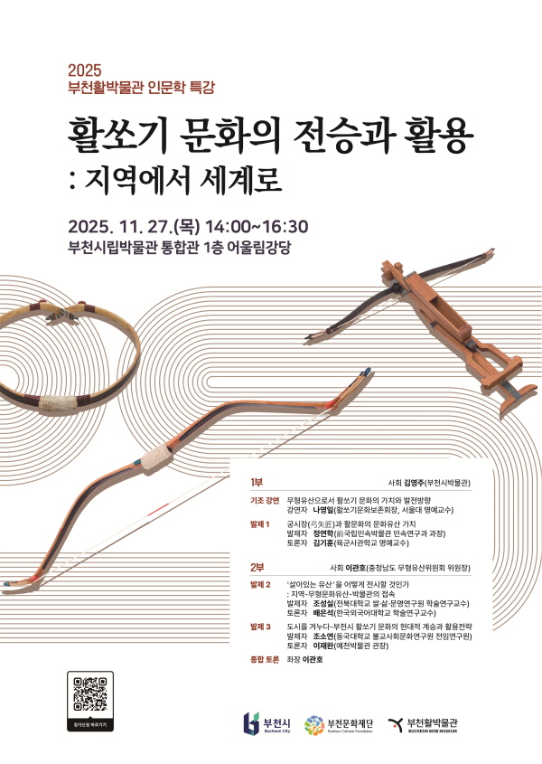 부천문화재단(대표이사 한병환)이 운영하는 부천활박물관은 오는 11월 27일(목) 오후 2시부터 부천시립박물관 통합관 1층 어울림강당에서 ‘활쏘기 문화의 전승과 활용’을 주제로 2025 활문화 학술세미나를 개최한다.