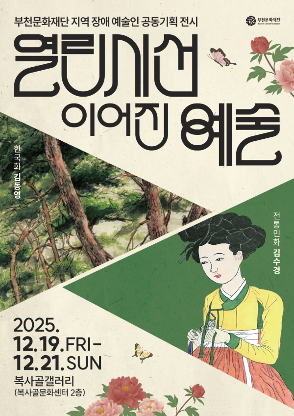 부천문화재단(이하 재단)은 지역 장애 예술인의 창작활동을 활성화하고 예술적 교류를 확대하기 위해 공동기획전시 <열린 시선, 이어진 예술>을 개최한다. 이번 전시는 오는 12월 19일(금)부터 21일(일)까지 3일간 복사골문화센터 2층 복사골갤러리에서 진행된다.