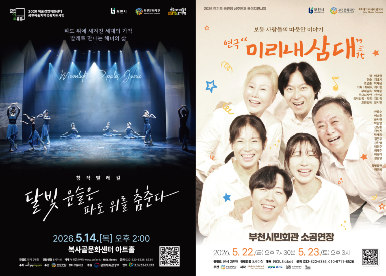 이에 앞서 5월 14일 복사골문화센터 아트홀에서는 창작발레컬 <달빛 윤슬은 파도 위를 춤춘다>가 공연된다. 제주 해녀의 삶과 세대 간 기억을 소재로 한 작품으로, 발레와 뮤지컬이 결합된 형식의 무대를 선보인다. 재단과 경기도부천교육지원청은 청소년의 문화 향유 확대를 위해 ‘2026 부천 모꼬지 문화예술 마·중’ 프로그램과 연계해 많은 중·고등학생이 관람할 것으로 예상된다.