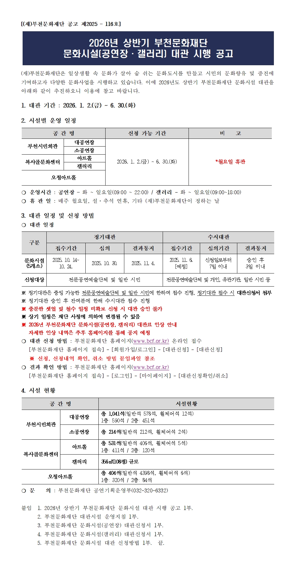 [공고 제2025-116호] 2026년 상반기 부천문화재단 문화시설(공연장·갤러리) 대관 시행 공고 구분 작성자 공연기획운영부 작성일 2025.09.04 조회수 976 파일 2026년 상반기 부천문화재단 문화시설 대관 시행 공고(안).pdf 다운로드 (재)부천문화재단 대관시설 운영지침.pdf 다운로드 부천문화재단 문화시설(공연장) 대관 신청서.hwp 다운로드 부천문화재단 문화시설(갤러리) 대관 신청서.hwp 다운로드 목록 이전 글 2025년 부천문화재단 세미나실 하반기 수시 대관 공고 [공고 제2025-118호] 2026년 상반기 부천문화재단 공연예술연습공간 정기·수시대관 시행 공고 다음글