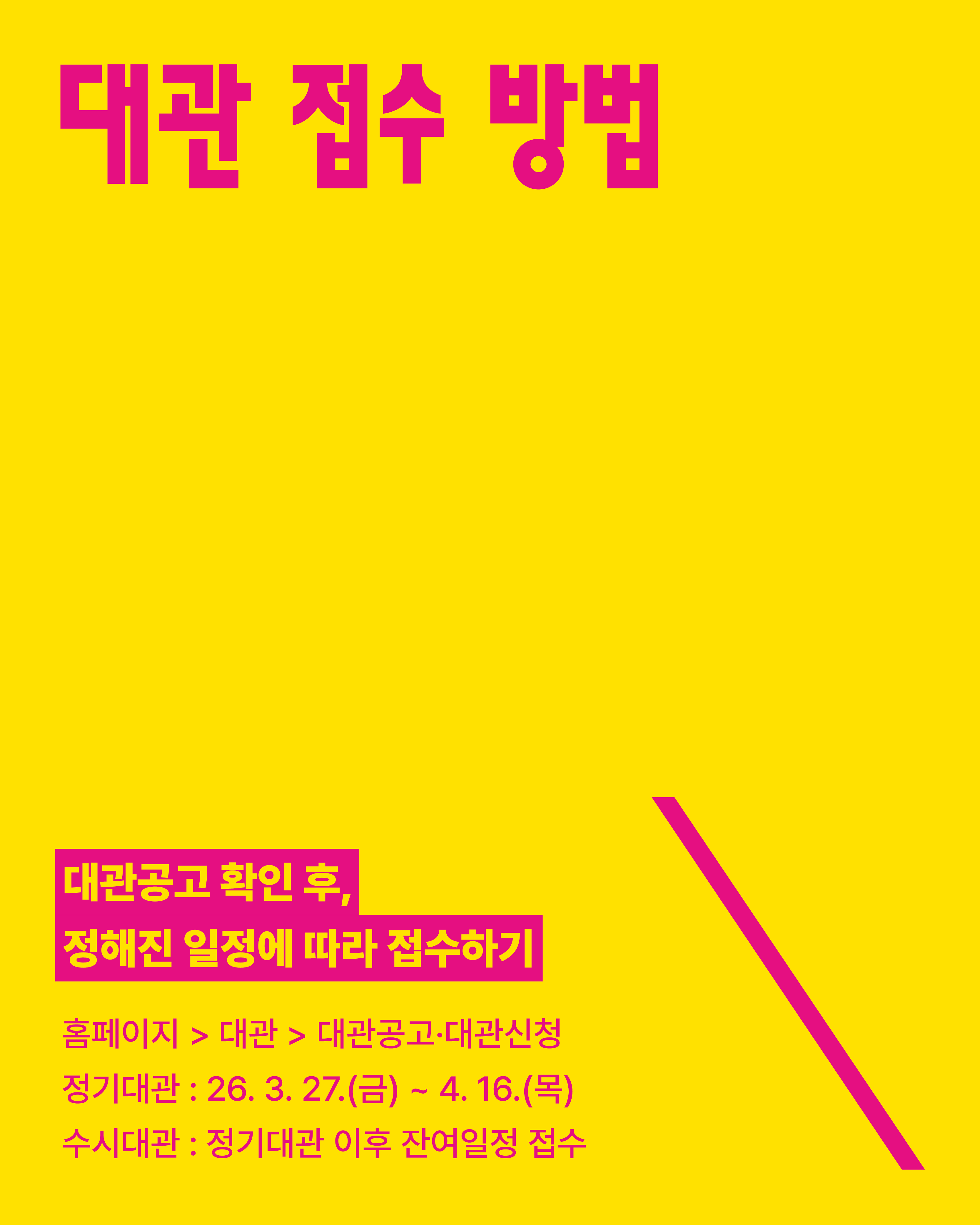 2026년 부천문화재단 문화시설(공연장,갤러리) 및 부천공연예술연습공간 하반기 정기대관 공고 구분 작성자 공연기획운영부 작성일 2026.02.28 조회수 747 파일 목록 이전 글 [공고 제2025-138호] 부천문화재단 2026년 상반기 세미나실 수시대관 시행 공고 [공고 제2026-027호] 2026년 하반기 부천문화재단 문화시설 대관 시행 공고 다음글