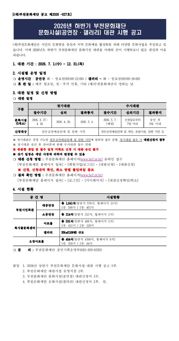 [공고 제2026-027호] 2026년 하반기 부천문화재단 문화시설 대관 시행 공고 구분 작성자 공연기획운영부 작성일 2026.03.20 조회수 416 파일 [붙임1] 2026년 하반기 부천문화재단 문화시설 대관 시행 공고.hwp 다운로드 [붙임2] 부천문화재단 대관시설 운영지침.pdf 다운로드 [붙임3] 부천문화재단 문화시설(공연장) 대관 신청서.hwp 다운로드 [붙임4] 부천문화재단 문화시설(갤러리) 대관 신청서.hwp 다운로드 목록 이전 글 2026년 부천문화재단 문화시설(공연장,갤러리) 및 부천공연예술연습공간 하반기 정기대관 공고 [공고 제2026-028호] 2026년 하반기 부천공연예술연습공간 대관 시행 공고 다음글