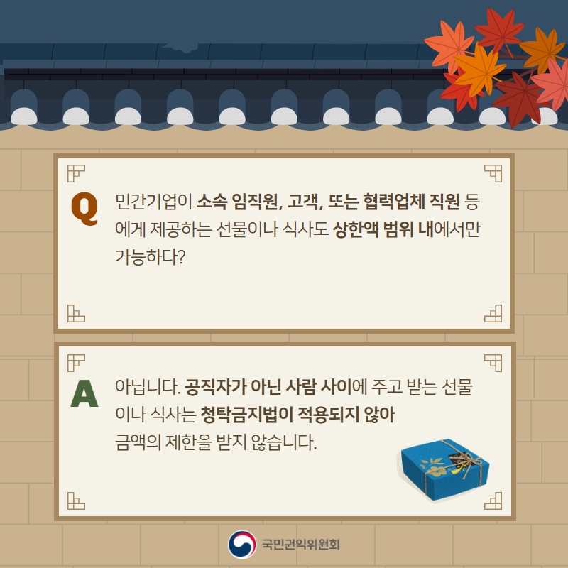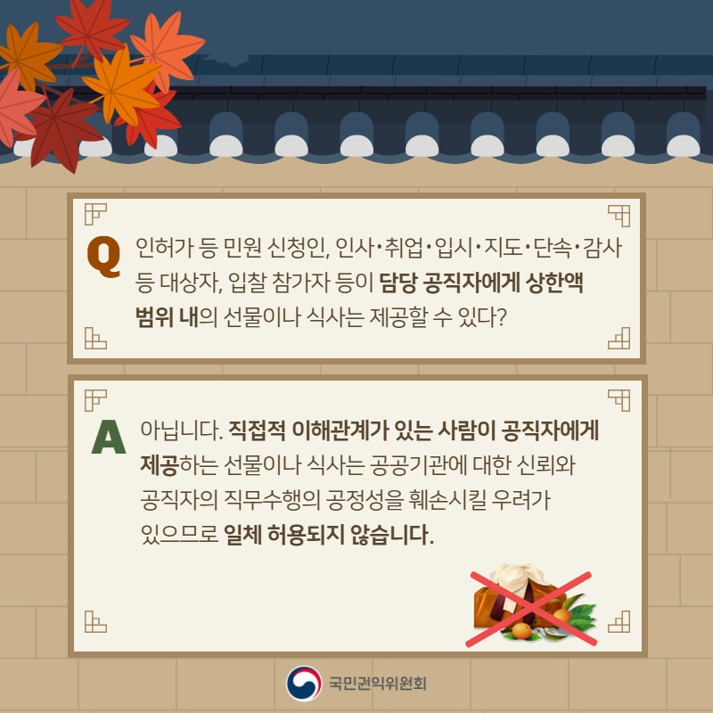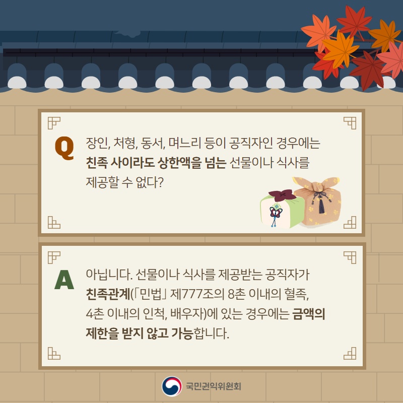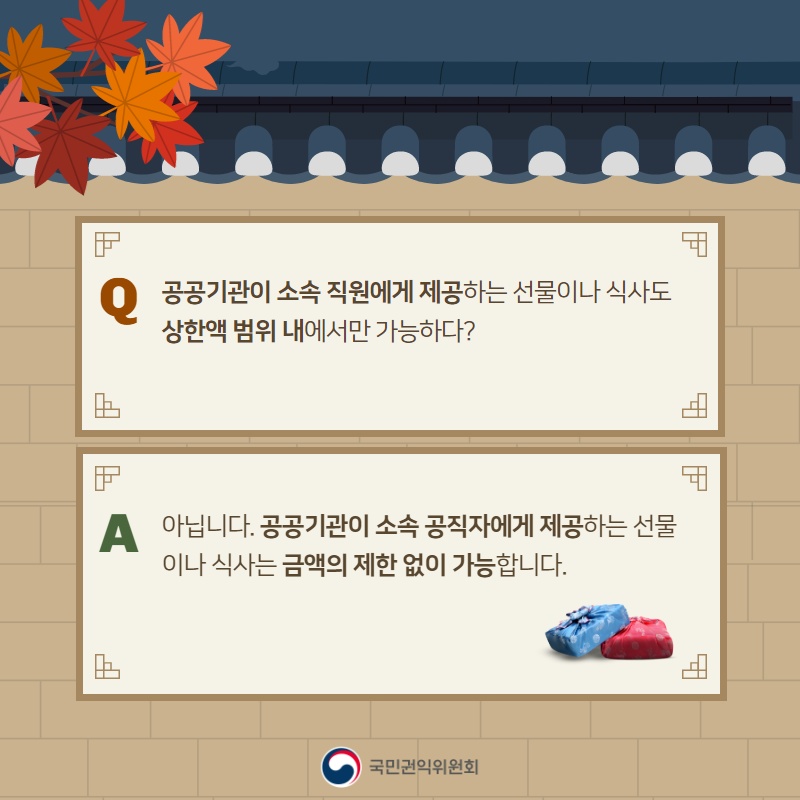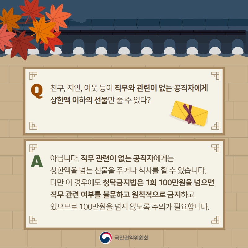 [카드뉴스] 추석맞이 선물,식사 Q&A 구분 청탁금지법 작성자 작성일 2019.10.16 조회수 파일 목록 이전 글 (공공기관용) 청탁금지법 신고자 보호.보상제도 안내자료 [사례집] 청탁금지법 유권해석 사례집 다음글