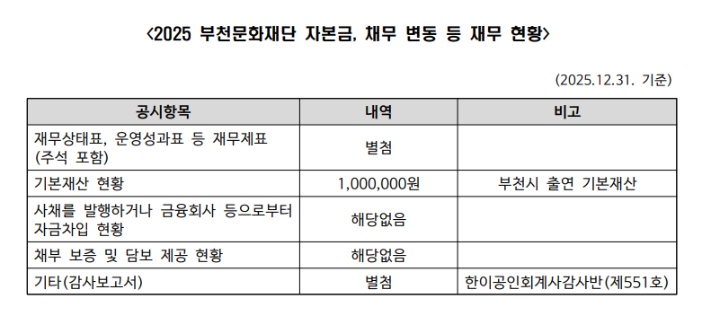 2025 자본금, 채무변동 등 재무현황 구분 작성자 정책기획부 작성일 2026.03.04 조회수 61 지방자치단체 출자·출연기관의 운영에 관한 법률 제32조(경영공시)에 의해 아래 사항을 공시합니다. ○ 공시책임자작성자 : 정책기획부장 변자영(032-320-6360)총괄자 : 경영본부장 김영욱(032-320-6304)감독자 : 경영지원부장 김중길(032-320-6310) 파일 2025 부천문화재단 재무제표(공시용).pdf 다운로드 (한이공인회계사감사반)_외부감사보고서(2025).pdf 다운로드 목록 이전 글 2025 부천문화재단 결산서