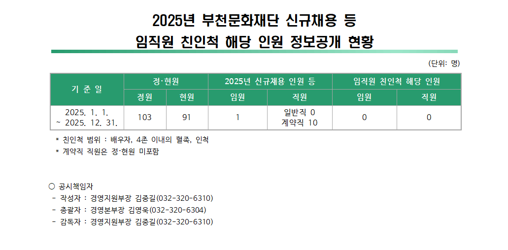 부천문화재단 신규채용 등 임직원 친인척 해당 인원 정보공개 현황(2025.1~12월) 구분 작성자 경영지원부 작성일 2025.12.22 조회수 211 파일 목록 이전 글 부천문화재단 신규채용 등 임직원 친인척 해당 인원 정보공개 현황(2024.1~12월)
