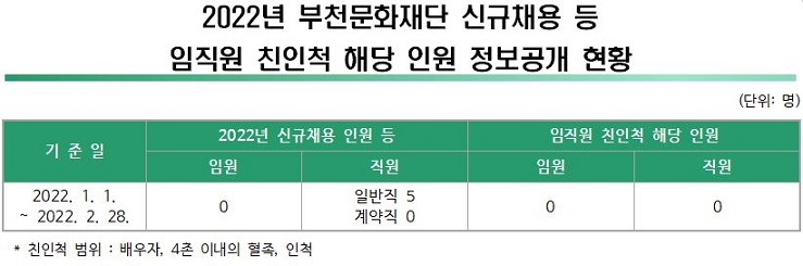 부천문화재단 신규채용 등 임직원 친인척 해당 인원 정보공개 현황(2022.2월) 구분 작성자 작성일 2022.03.05 조회수 파일 목록 이전 글 부천문화재단 신규채용 등 임직원 친인척 해당 인원 정보공개 현황(2022.1월) 부천문화재단 신규채용 등 임직원 친인척 해당 인원 정보공개 현황(2022.3월) 다음글