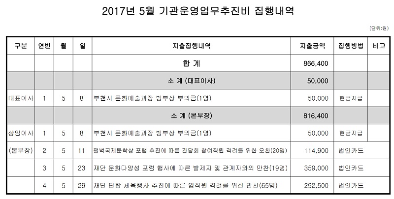 2017년 5월 부천문화재단 기관운영업무추진비 집행내역 구분 작성자 작성일 2017.06.05 조회수 파일 5월 기관운영업무추진비 집행내역.pdf 다운로드 목록 이전 글 2017년 4월 부천문화재단 기관운영업무추진비 집행내역 2017년 6월 부천문화재단 기관운영업무추진비 집행내역 다음글