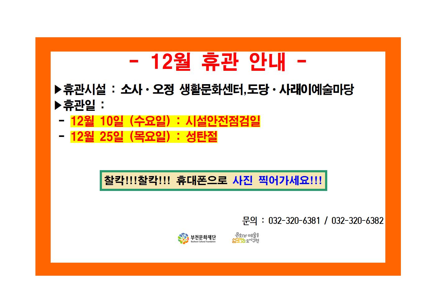 [부천생활문화시설] 12월 휴관 일정 안내 구분 공지 작성자 시민문화진흥부 작성일 2025.11.11 조회수 982 파일 목록 이전 글 2025년 12월 부천문화재단 생활문화시설 수시•단기 대관 안내