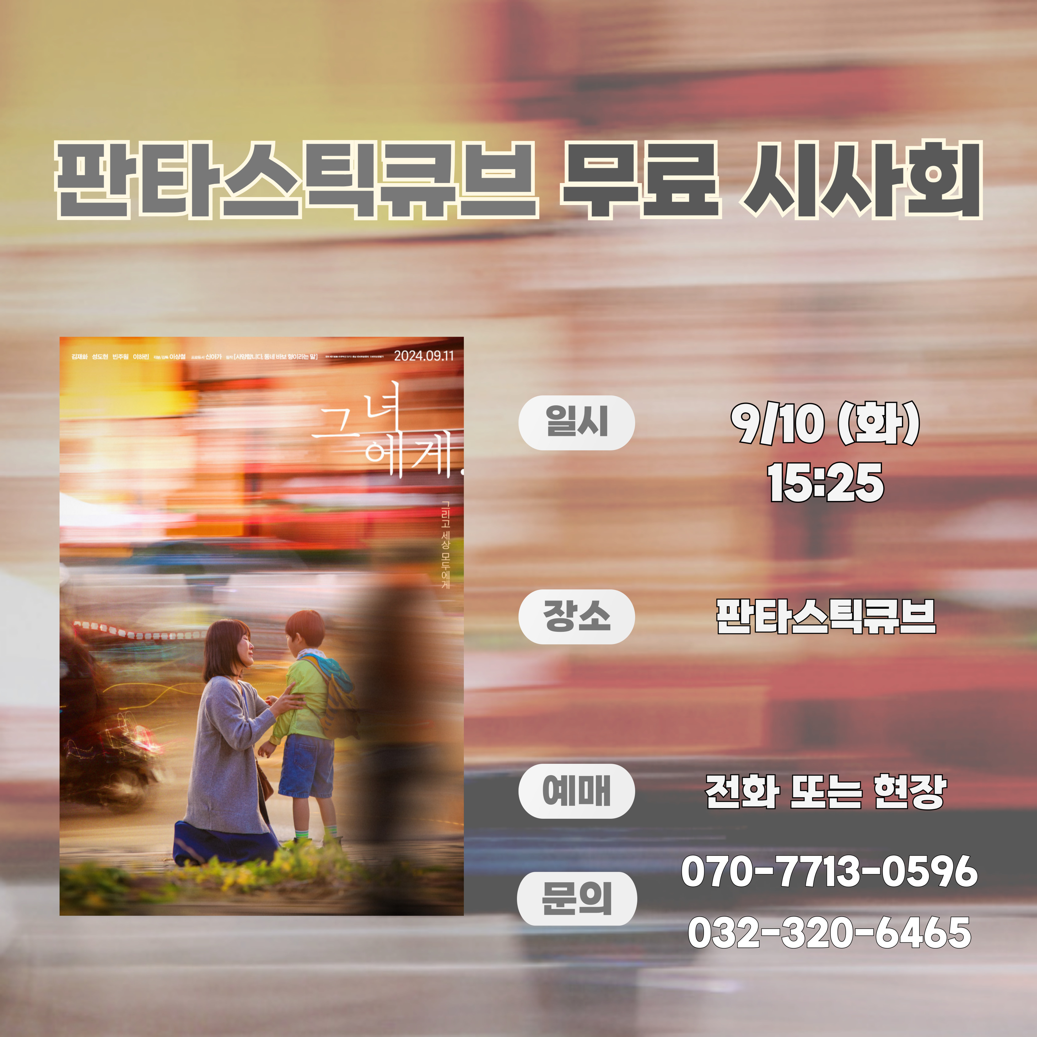 상영예정작 12 9/10 판타스틱큐브 영화 <그녀에게> 무료 시사회 신청일 2024-09-10 ~ 2024-09-10 상영시간 상영관 상영관 정보 없음 대상 12세 정보 드라마 / 105분 감독 이상철 출연진 김재화, 성도현, 빈주원, 이하린 로그인 후 예매 가능 목록 목록