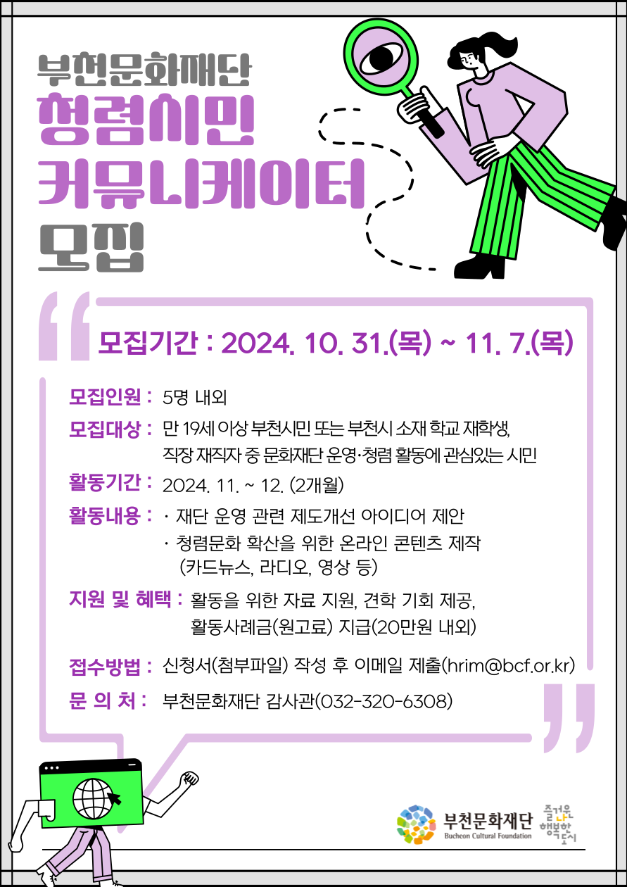 부천문화재단에서는 공정하고 투명한 재단 운영을 위해 시민의 의견을 듣고 반부패 실현을 위한 아이디어를 발굴하기 위하여 청렴시민 커뮤니케이터를 모집하오니, 많은 관심과 참여 바랍니다.