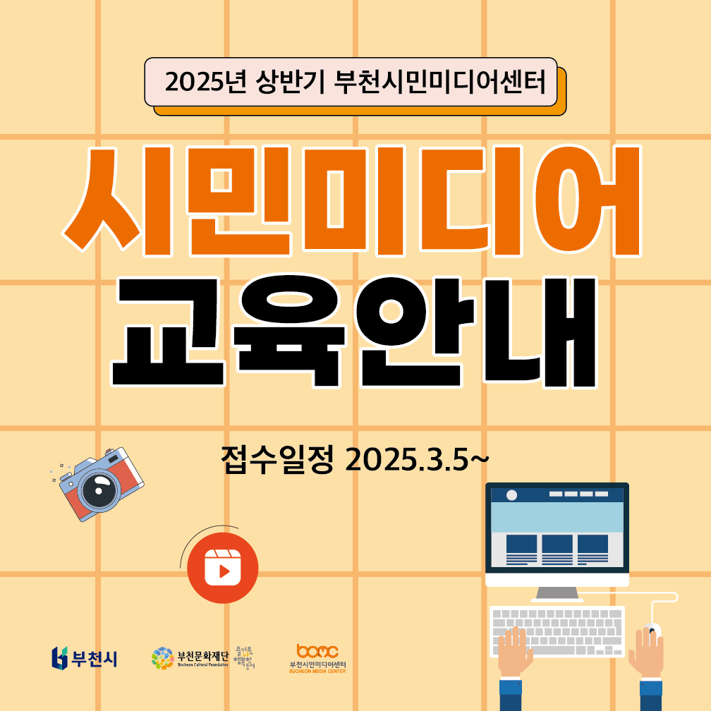 마감 [부천시민미디어센터] 2025 상반기 시민미디어교육 안내 운영일자 2025-03-18 ~ 2025-07-02 장소 부천시민미디어센터 참가비 80,000원 연령 만20세 이상 문의 032-320-6405 첨부파일 본문 클릭시 부천시민미디어센터 교육안내 페이지로 이동합니다. 목록