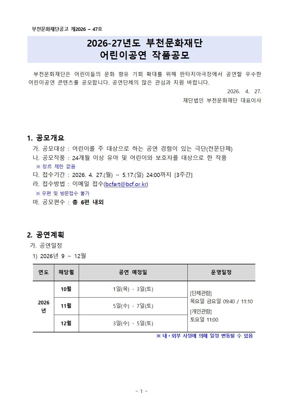접수중 2026-27년도 부천문화재단 어린이공연 작품공모 운영일자 2026-04-27 ~ 2026-05-17 문의 첨부파일 2026-27년 어린이공연공모_공고문.pdf 2026-27년 어린이공연공모_지원서.hwp 000 목록