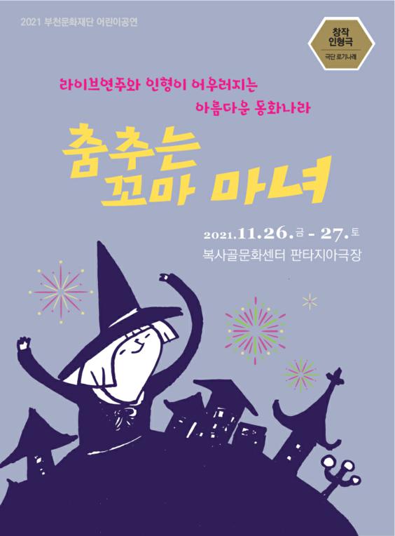 2025121520211126공연종료 창작인형극 <춤추는 꼬마마녀> 기간 2021-11-26 ~ 2021-11-27 장소 판타지아극장 시간 50(분) 대상 24개월이상 문의 032-320-6334,6336 상세정보 기타정보 목록