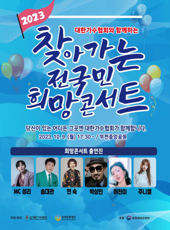 2025121520231009공연종료 2023 찾아가는 전국민 희망 콘서트 기간 2023-10-09 장소 부천중앙공원 시간 90분 주최 대한가수협회 문의 032-320-6345 상세정보 기타정보 목록