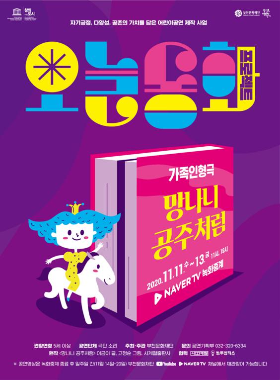 2025121520201111공연종료 오늘동화프로젝트 <망나니 공주처럼> 기간 2020-11-11 ~ 2020-11-13 장소 판타지아극장 시간 30분 대상 5세 이상 주최 (재)부천문화재단 문의 032-320-6336 상세정보 기타정보 목록