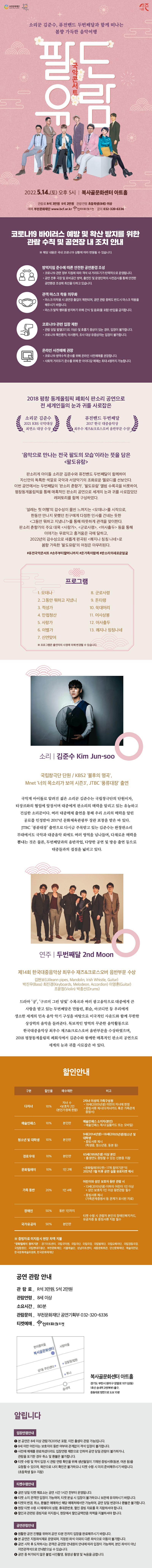 2025121620220514공연종료 [국악] 김준수x두번째달-팔도유람 기간 2022-05-14 장소 복사골문화센터아트홀 시간 80분 대상 8세이상 주최 (재)부천문화재단, 두번째달 문의 032-320-6336 상세정보 기타정보 본 공연은 현재 인터파크에서 예매 중입니다. (예매처 링크: https://tickets.interpark.com/goods/22003656 ) 목록