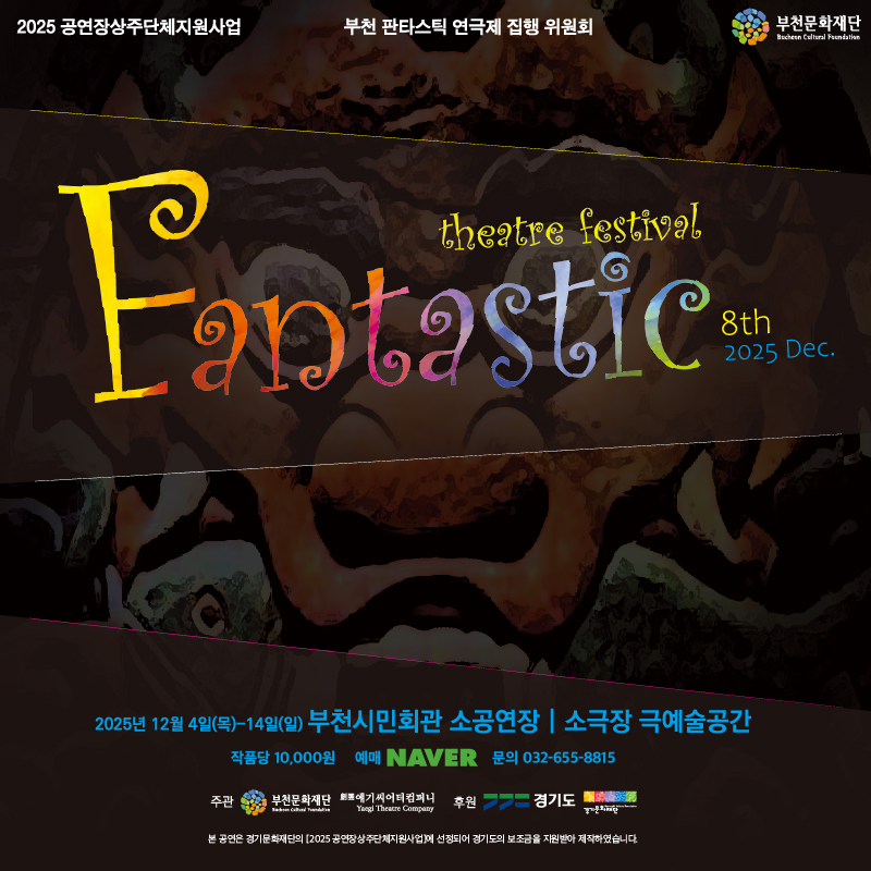 2025121520251204공연종료 제8회 판타스틱연극제 기간 2025-12-04 ~ 2025-12-14 장소 부천시민회관소극장/대연습실/극예술공간 가격 네이버예매 상세정보 기타정보 목록