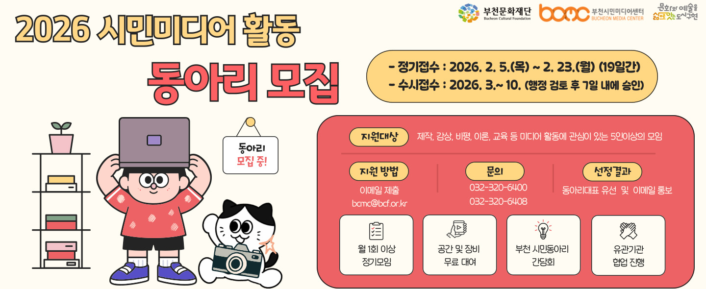 공지 2026년 3월 부천문화재단 생활문화시설 수시•단기 대관 안내 2026-02-05 16:37:07 공지 소사구청 청사 방역(소독) 실시 안내(2.7. 토요일 오전) 2026-02-04 17:38:57 공지 [부천생활문화시설] 2월 휴관 일정 안내 2026-01-27 14:34:07 공지 설 연휴기간 웹서비스 일시중단 안내 2026-01-27 13:23:31 이전 슬라이드 다음 슬라이드 1 /