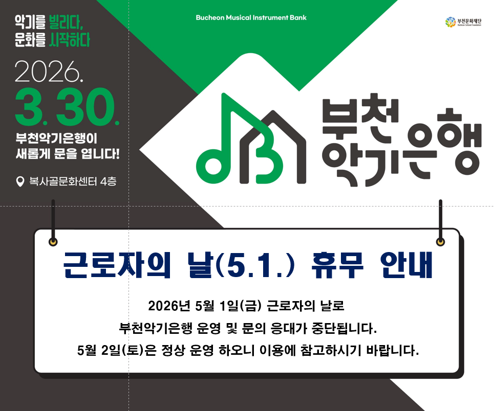 2026.04. 16 부천악기은행 대기자 알림 기능 안내 2026.04. 10 부천악기은행 대여료 결제 및 연장신청 안내 2026.04. 09 악기대여 방문 전 신청일 및 안내문자 확인 부탁드립니다 더보기