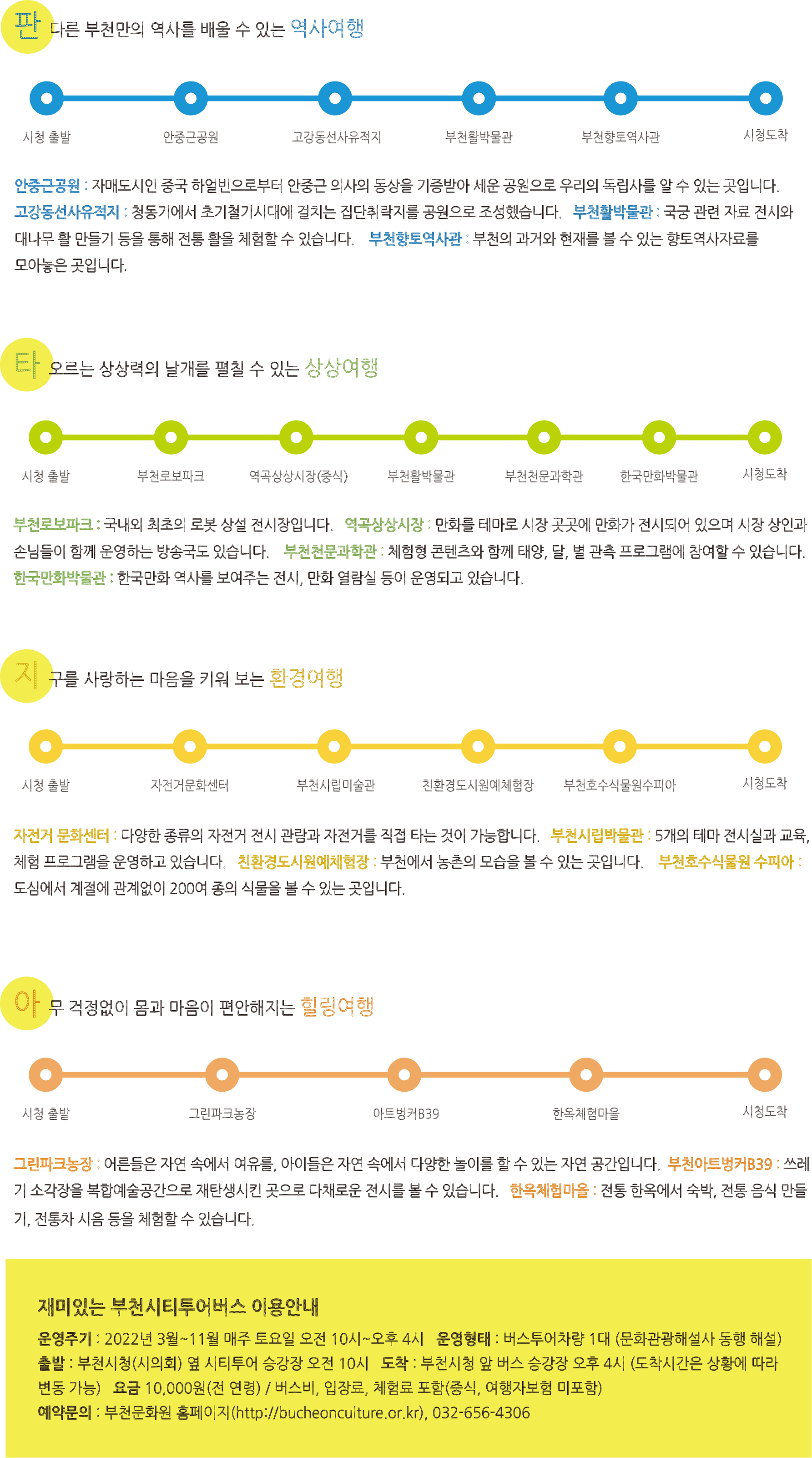 여러분은 부천을 얼마나 즐기고 계신가요? 알고 보면 부천에 즐길거리가 참 많습니다. 그런데 또 막상 어디엔가 가려고 하다 보면, 어디를 가야하는지 혹은 그곳에서 뭘 해야 하는지 등 고민될 때가 많은데요. 그런 분들을 위해 부천시티투어 버스를 준비해 보았습니다.