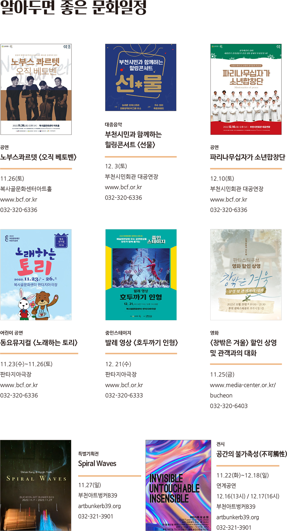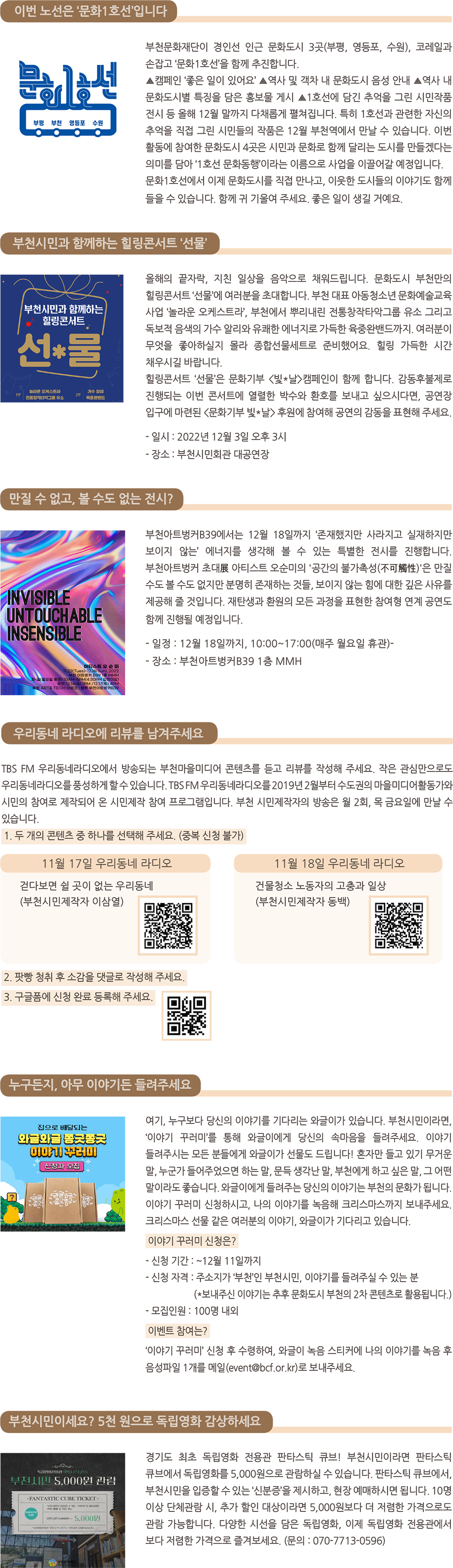 올해의 끝이 코앞으로 다가왔습니다. 조급한 마음이 생기시나요? 혹은 풍성함을 느끼시나요? 지금의 아쉬움 혹은 풍성한 마음이 다음 해를 계속 살아가게 하는 자양분이 될 것입니다. 정신없이 달려온 당신에게 잠시 숨을 고르고, 도시의 삶을 지속하도록 북돋워 주는 다양한 문화예술 소식을 전해드립니다.