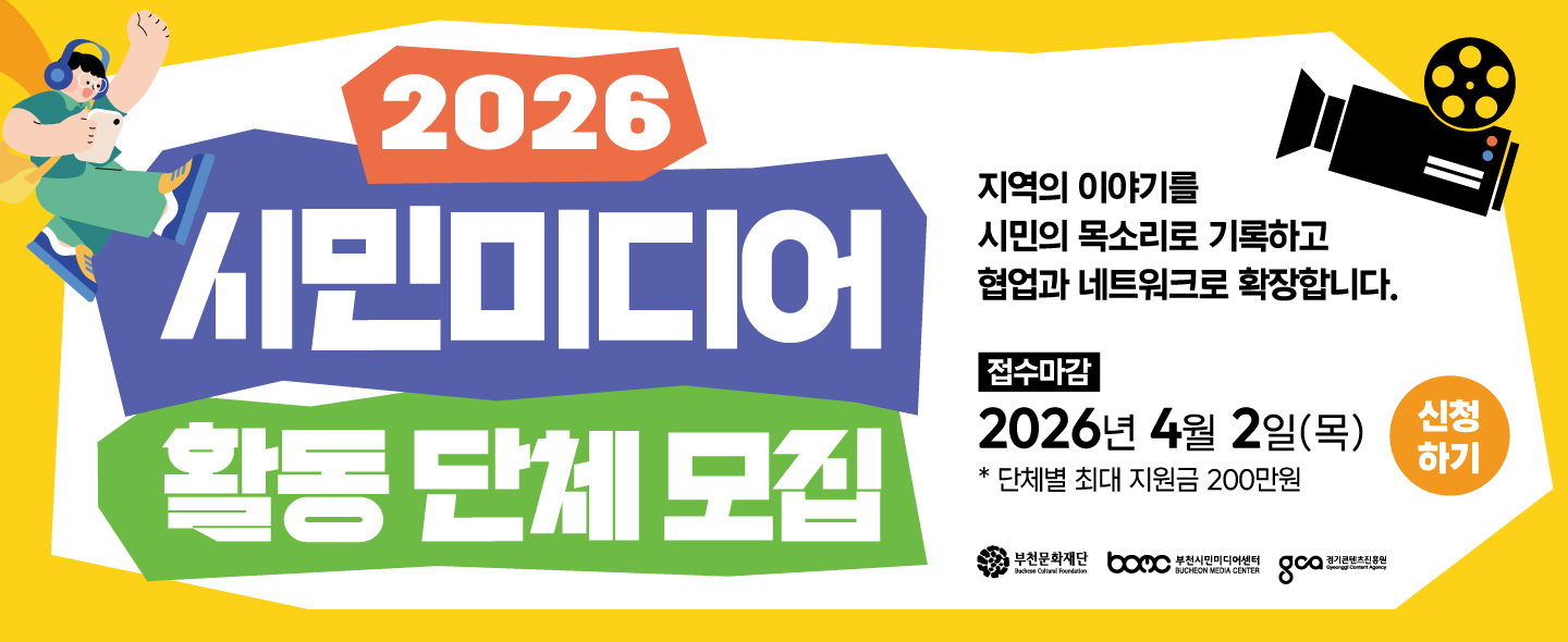 공지 더보기 VHS비디오테이프 디지털 변환 사업 종료 안내 2025-12-26 15:18:26 부천시민미디어센터 12.20.~ 12.31. 대관·대여 이용시, 선결제 안내 2025-12-03 18:41:47 12월 <수요시네마> 및 추후 상영 안내 2025-11-25 13:31:06 '찾아가는 미디어임팩트 상영회' 참여단체 모집 2025-10-29 16:24:54 수요시네마 1/1 현재 신청기간에 해당하는 영화가 없습니다.