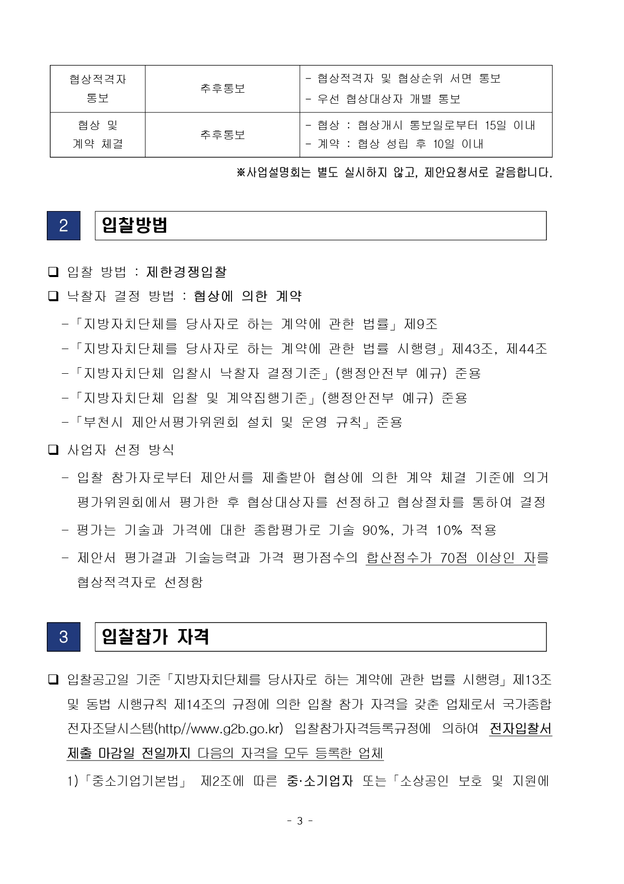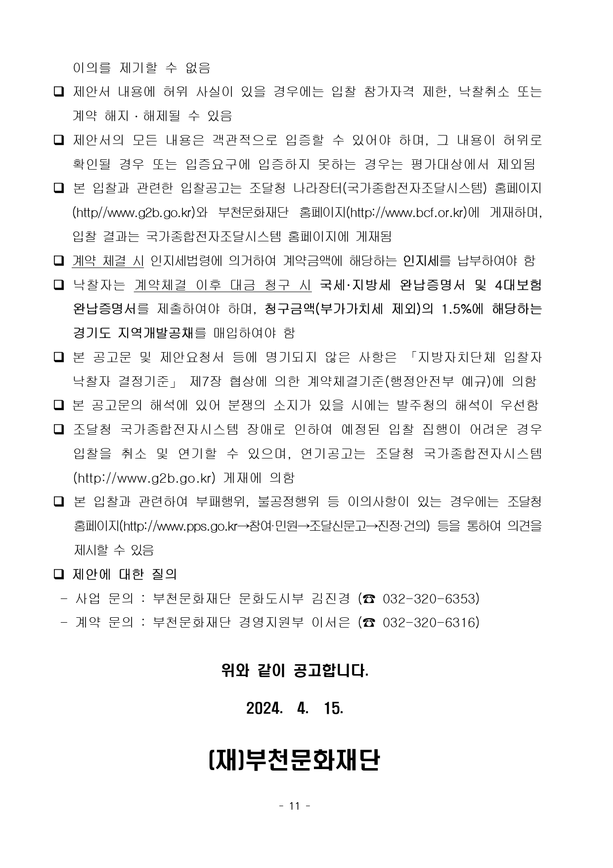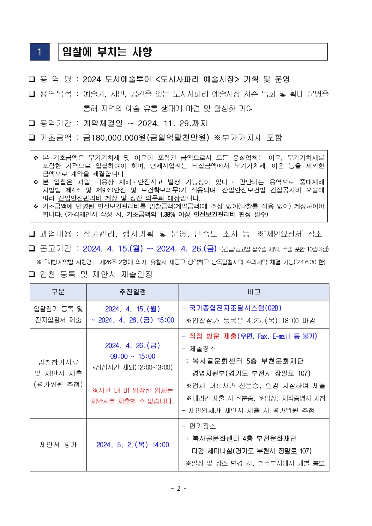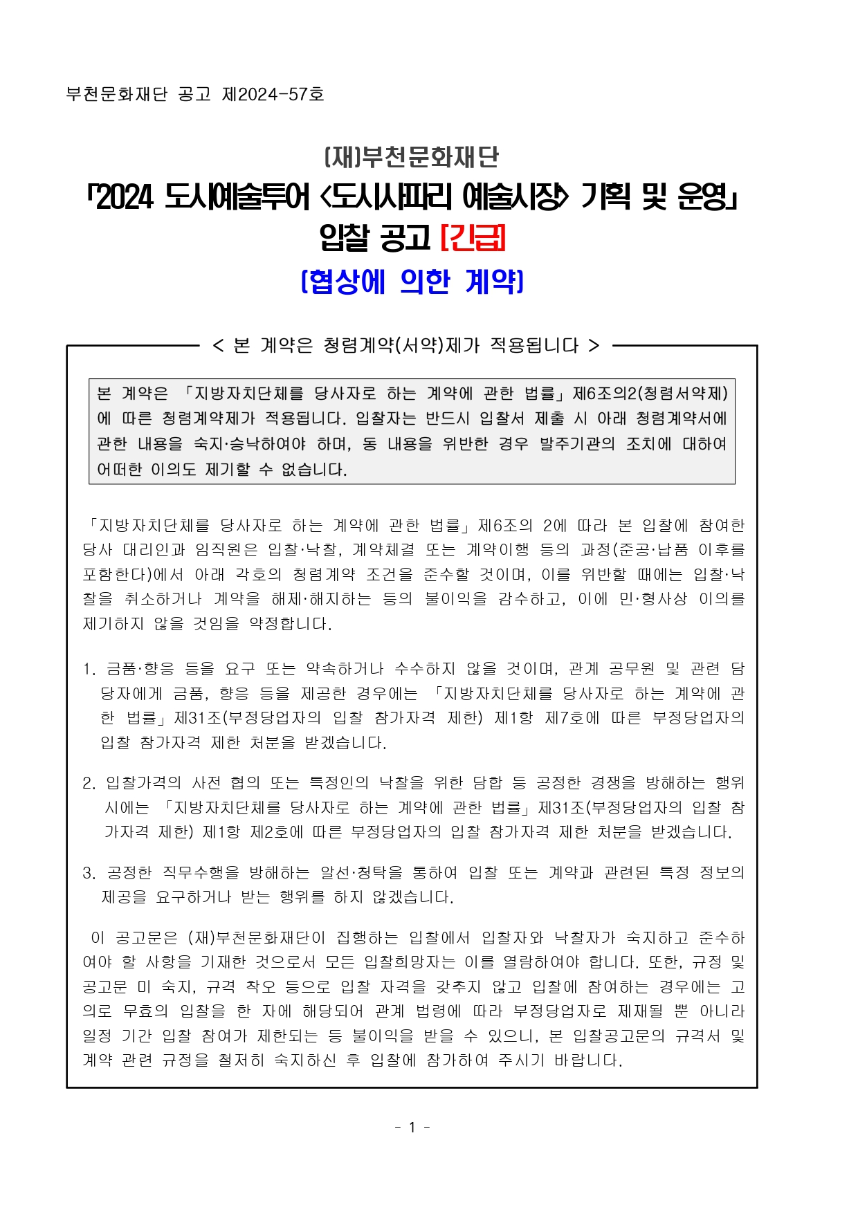 [공고 제2024-57호] 2024 도시예술투어 <도시사파리 예술시장> 기획 및 운영(신규) (협상에 의한 계약) 구분 작성자 경영지원부 작성일 2024.04.15 조회수 22421 파일 [입찰공고문] 2024 도시예술투어 도시사파리 예술시장 기획 및 운영_(재)부천문화재단.hwp 다운로드 [제안요청서] 2024 도시예술투어 도시사파리 예술시장 기획 및 운영_(재)부천문화재단.hwp 다운로드 목록 이전 글 [공고 제2023-120호] 공유문화 프로젝트 기획 및 운영 용역(신규) (협상에 의한 계약) [공고 제2024-84호] <2024 부천아트페어 기획 및 운영 총괄> 용역 (신규) 다음글