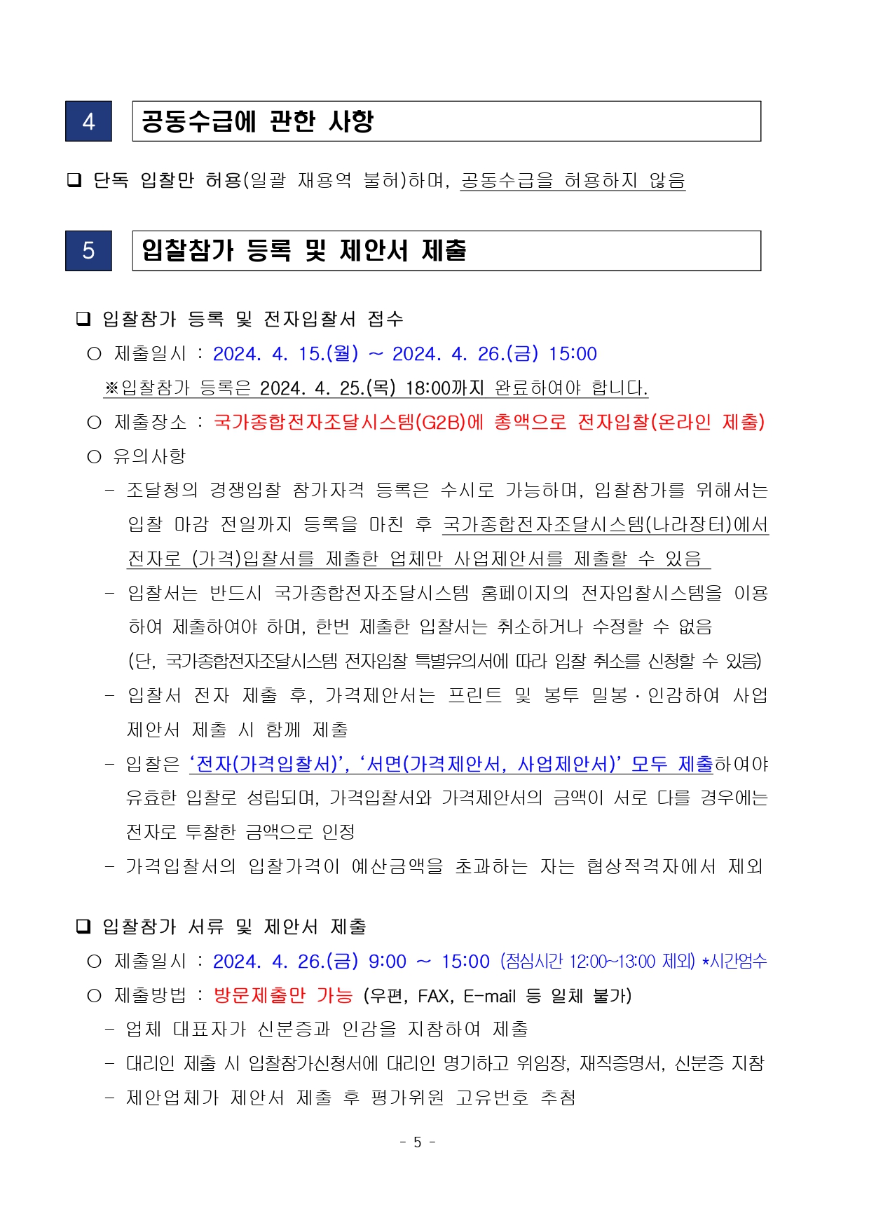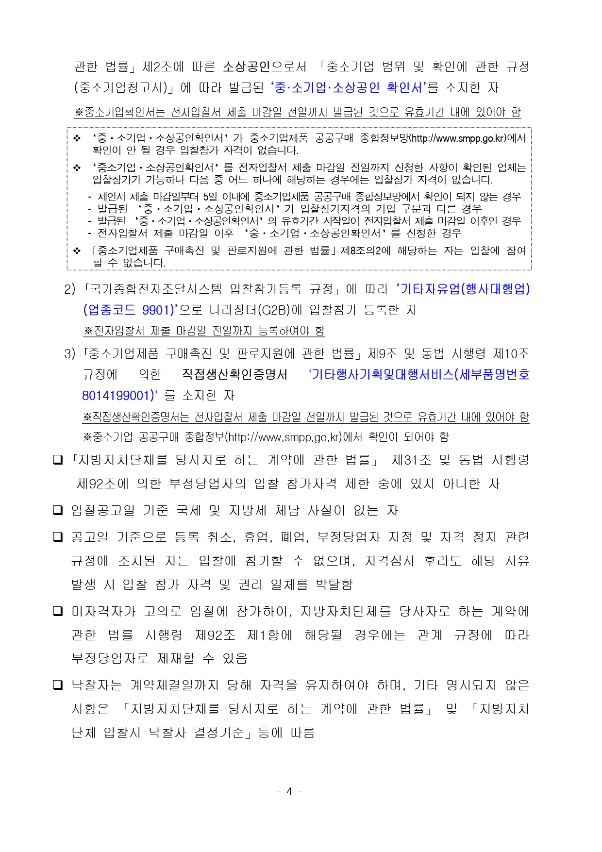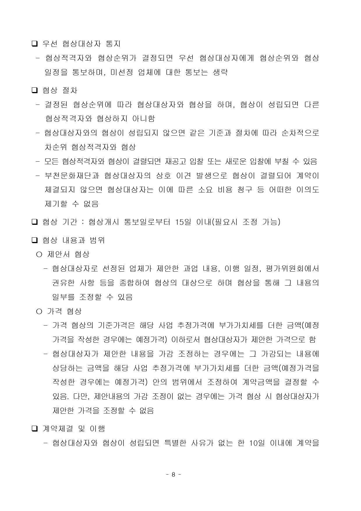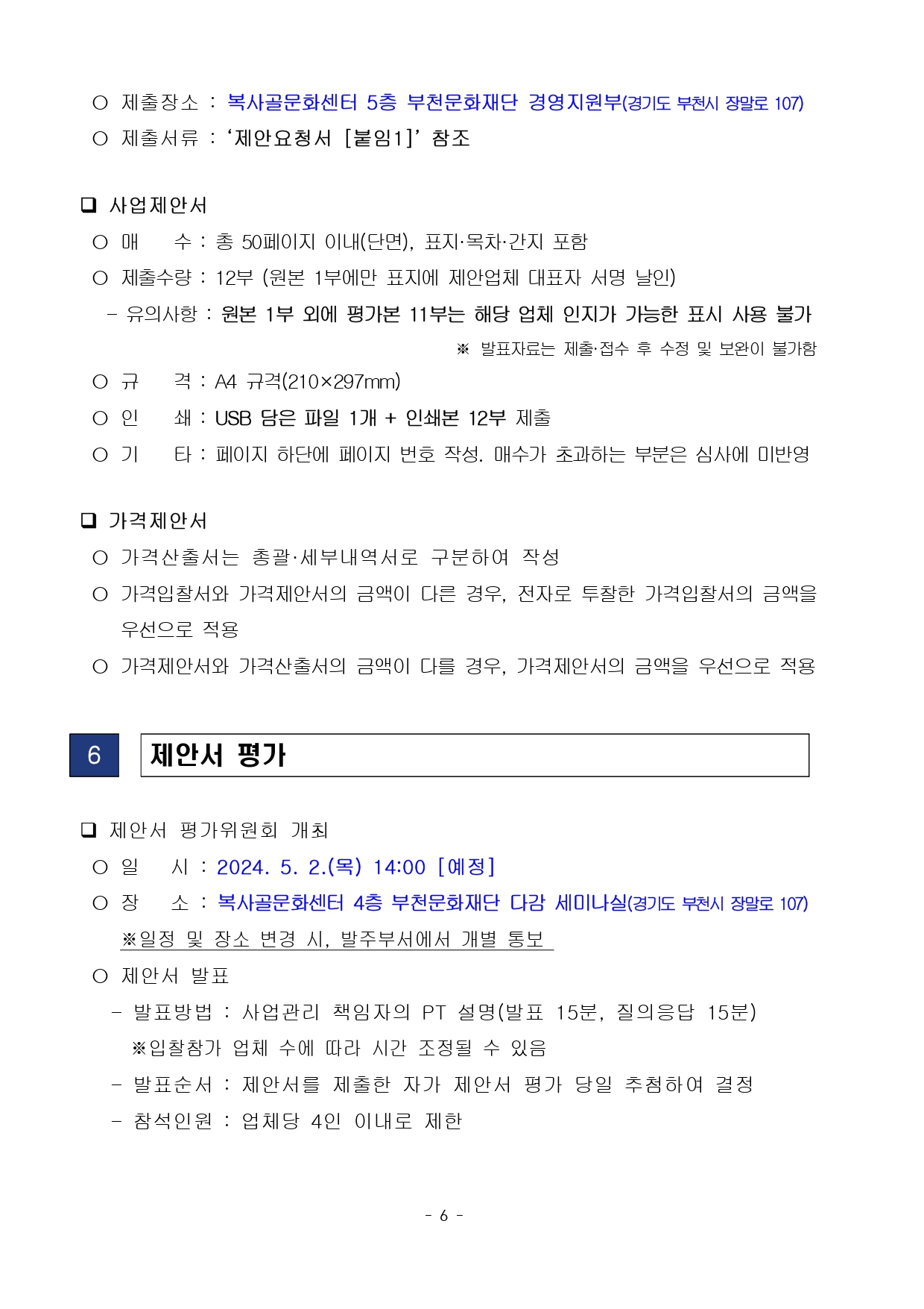 [공고 제2024-57호] 2024 도시예술투어 <도시사파리 예술시장> 기획 및 운영(신규) (협상에 의한 계약) 구분 작성자 경영지원부 작성일 2024.04.15 조회수 22421 파일 [입찰공고문] 2024 도시예술투어 도시사파리 예술시장 기획 및 운영_(재)부천문화재단.hwp 다운로드 [제안요청서] 2024 도시예술투어 도시사파리 예술시장 기획 및 운영_(재)부천문화재단.hwp 다운로드 목록 이전 글 [공고 제2023-120호] 공유문화 프로젝트 기획 및 운영 용역(신규) (협상에 의한 계약) [공고 제2024-84호] <2024 부천아트페어 기획 및 운영 총괄> 용역 (신규) 다음글