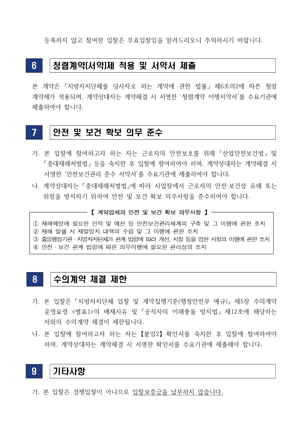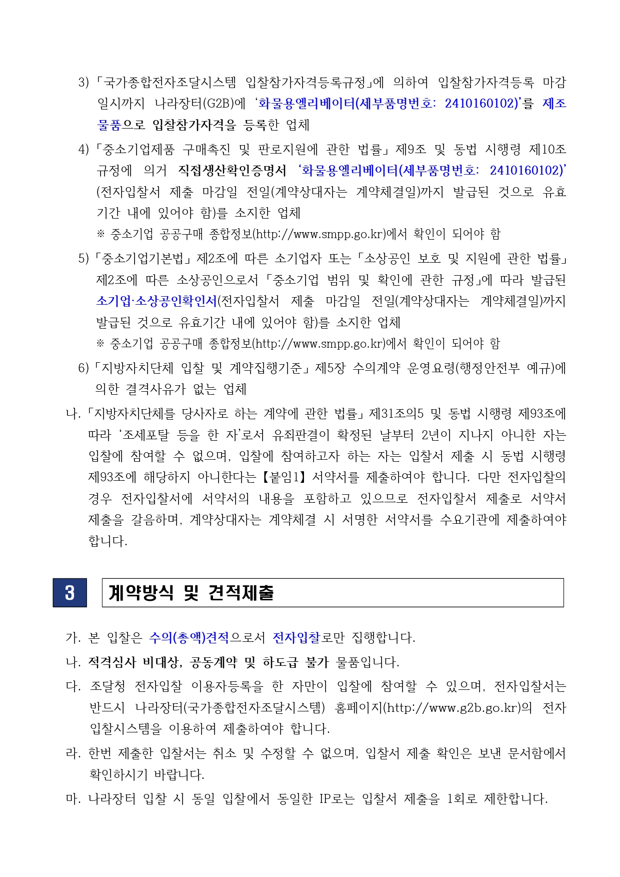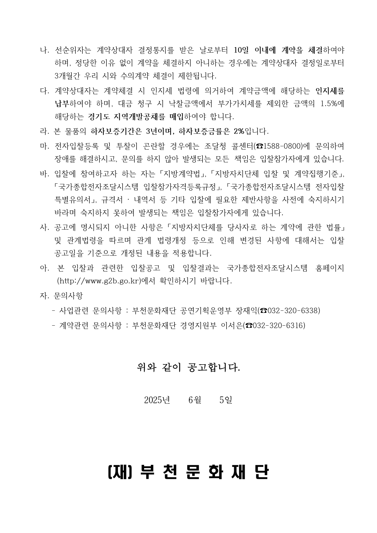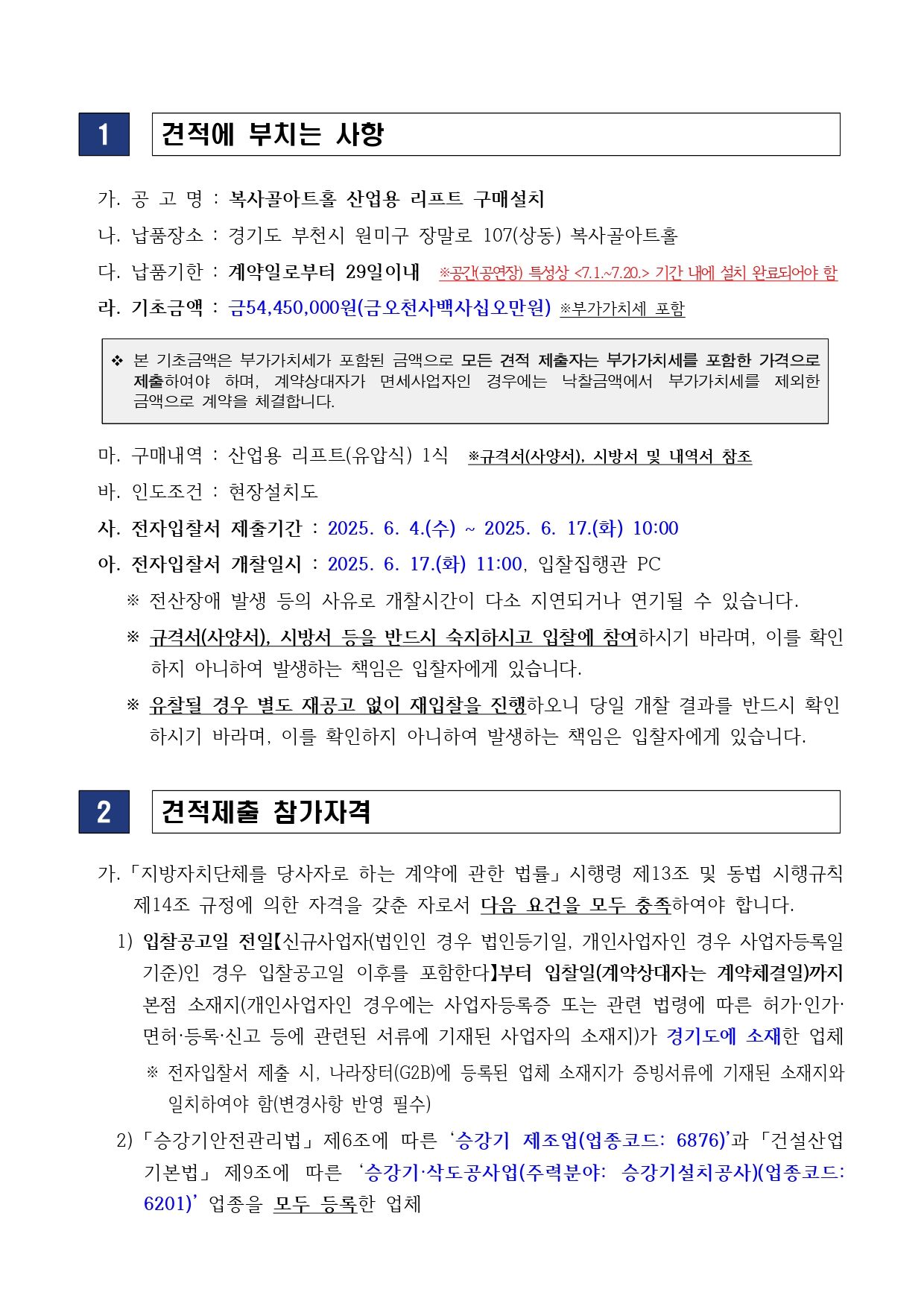 [공고 제2025-68호] 복사골아트홀 산업용 리프트 구매설치(소액수의 견적제출_2인이상(물품)) 구분 작성자 경영지원부 작성일 2025.06.05 조회수 254 파일 입찰공고문_소액수의(물품) 견적제출_복사골아트홀 산업용 리프트 구매설치.hwp 다운로드 규격서(사양서)_복사골아트홀 산업용 리프트 구매설치.pdf 다운로드 시방서_복사골아트홀 산업용 리프트 구매설치.hwp 다운로드 (공)내역서_복사골아트홀 산업용 리프트 구매설치.xls 다운로드 목록 이전 글 [공고 제2024-154호] 2024 부천 비보잉 & K-댄스 페스티벌 운영 대행 용역(협상에 의한 계약) [공고 제2025-72호] 부천문화재단 5개소 공연장 정밀안전진단 및 구조해석 용역(소액수의 견적제출_2인이상(용역)) 다음글