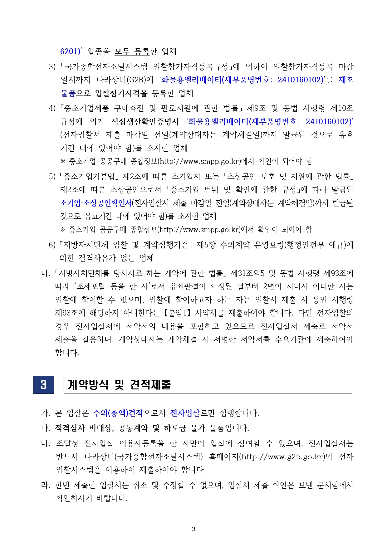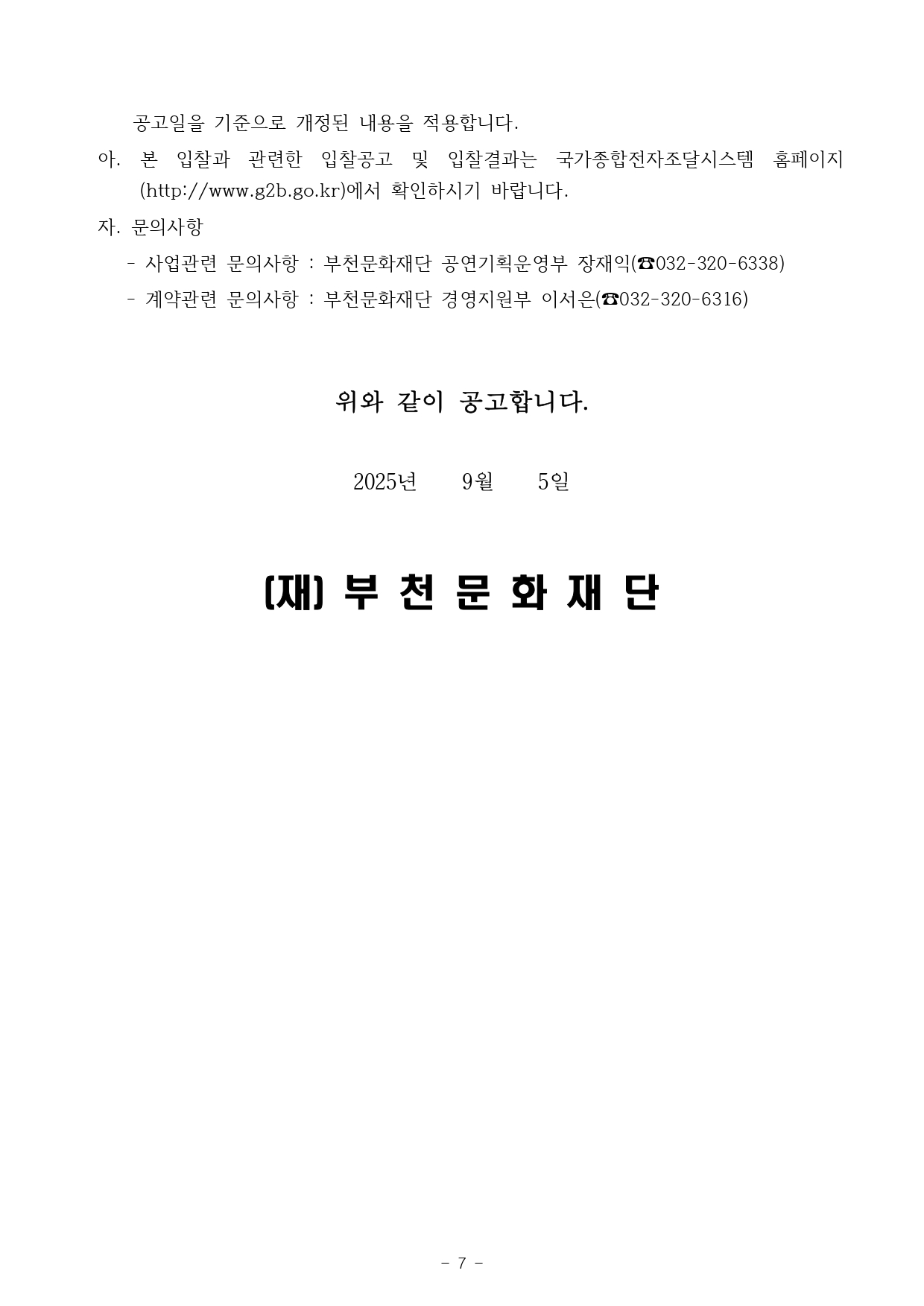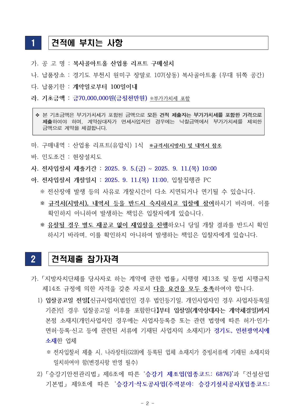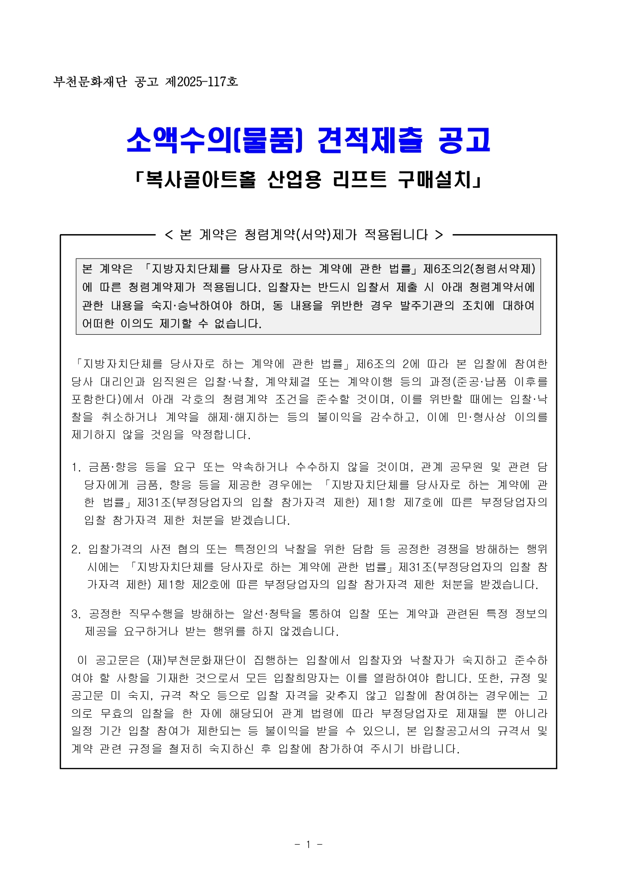 [공고 제2025-117호] 복사골아트홀 산업용 리프트 구매설치(소액수의 견적제출_2인이상(물품)) 구분 작성자 경영지원부 작성일 2025.09.05 조회수 127 파일 입찰공고문_소액수의(물품) 견적제출_복사골아트홀 산업용 리프트 구매설치.hwp 다운로드 규격서(시방서)_복사골아트홀 산업용 리프트 구매설치.hwp 다운로드 (공)내역서_복사골아트홀 산업용 리프트 구매설치.xlsx 다운로드 목록 이전 글 [공고 제2025-109호] 제10회 부천 국제 브레이킹 대회(BIBC) 운영 대행 용역(협상에 의한 계약) [공고 제2025-139호] 2026년 부천문화재단 공연장 무대기계 유지관리 용역(소액수의 견적제출_2인이상(용역)) 다음글