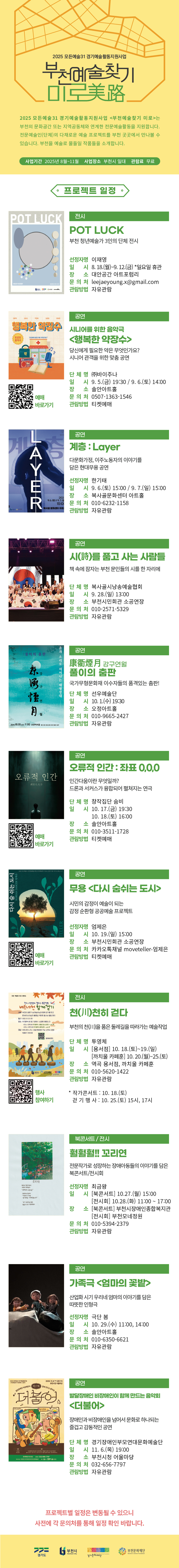 2025 모든예술31 경기예술활동지원 <부천예술찾기 미로美路> 예술 프로젝트 일정 구분 행사 작성자 도시문화창작부 작성일 2025.08.27 조회수 16623 2025 모든예술31 경기예술지원 <부천예술찾기 미로美路> 예술 프로젝트 일정입니다. 각 프로젝트별 관람문의는 선정 예술가(단체)에게 부탁드립니다.※ 모든 프로젝트의 일정은 주최(단체)측의 사정에 따라 변경될 수 있습니다. 파일 목록 이전 글 [공고 제2025-109호]제10회 부천 국제 브레이킹 대회(BIBC) 운영 대행 용역(협상에 의한 계약) 2025 차세대전문예술활동지원 <내일의 예술가> 아티스트 프레젠테이션 시민심사단 모집 다음글