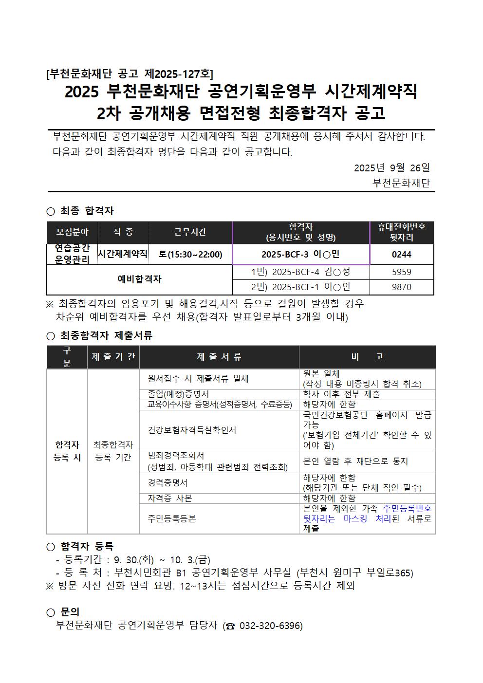 [공고 제2025-127호] 2025 부천문화재단 공연기획운영부 시간제계약직 2차 공개채용 면접전형 최종합격자 공고 구분 채용 작성자 공연기획운영부 작성일 2025.09.26 조회수 3805 파일 목록 이전 글 부천문화재단 청렴시민커뮤니케이터「청렴카드뉴스 공모」 [공고 제2025-126호] 2025 제22회 부천신인문학상 당선작 발표 다음글