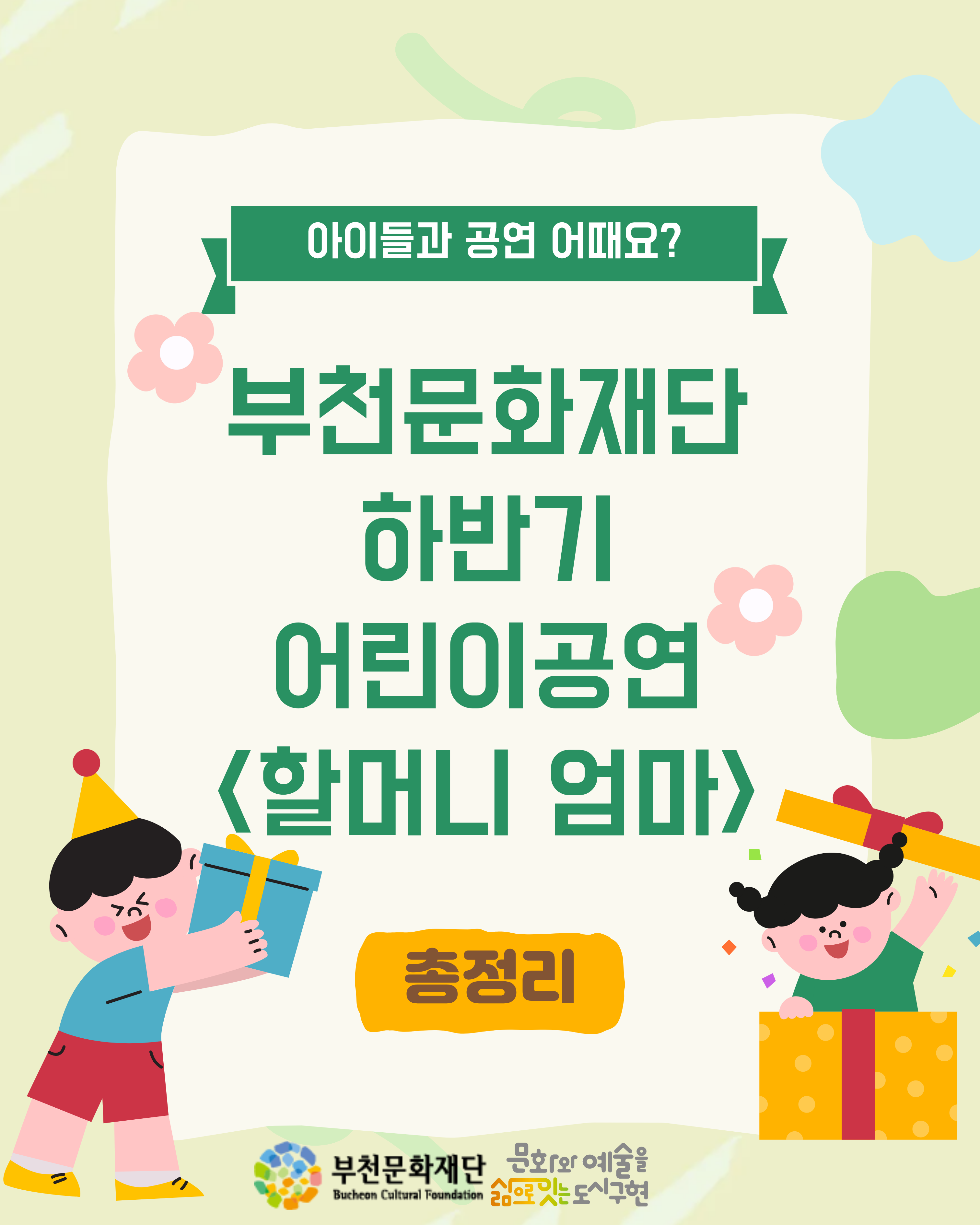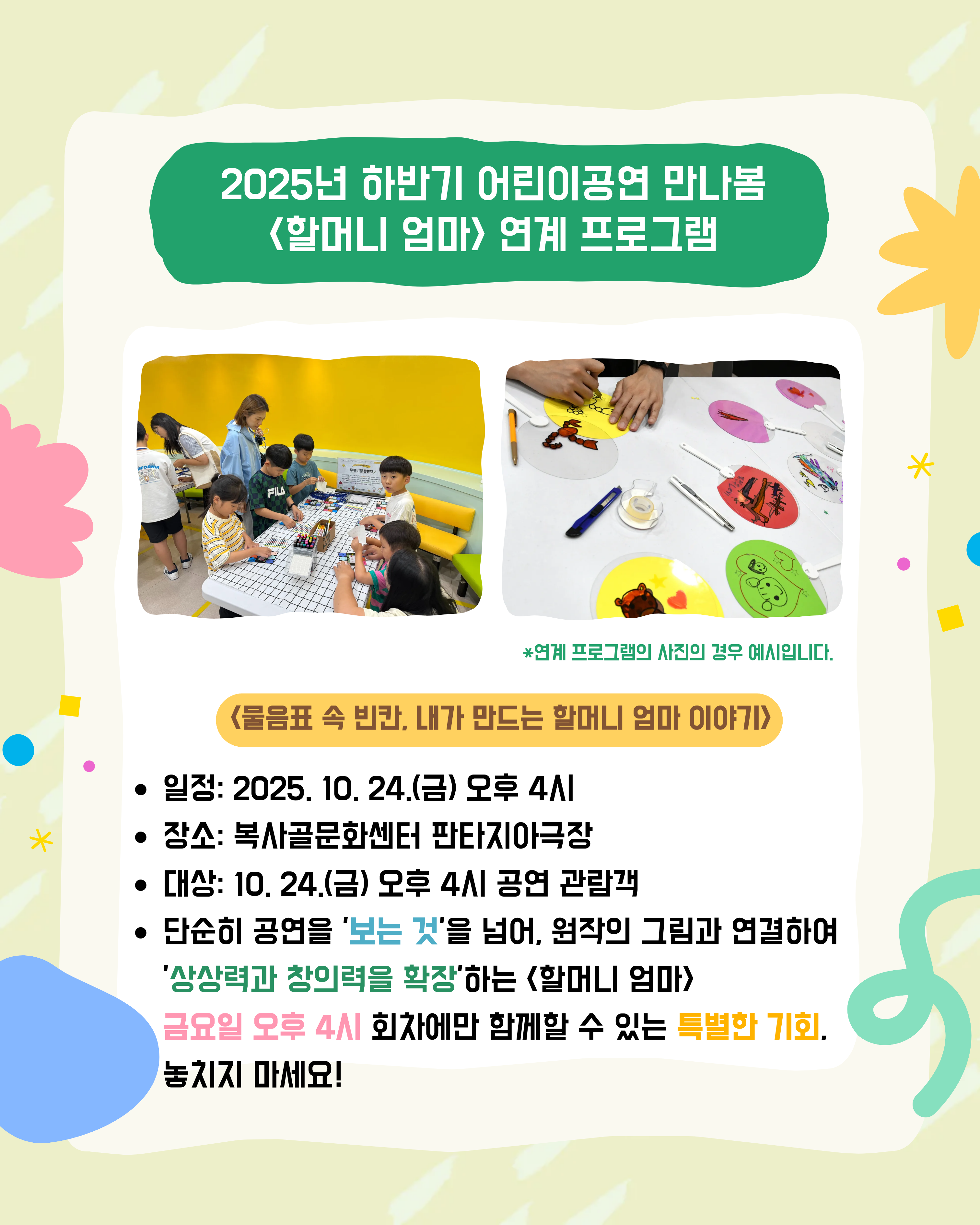 가족뮤지컬 <할머니 엄마> 연계프로그램 - 물음표 속 빈칸, 내가 만드는 할머니 엄마 이야기 구분 공연 작성자 공연기획운영부 작성일 2025.09.30 조회수 5340 예매처: https://buly.kr/4mdJCEZ 파일 목록 이전 글 2025 부천 시민미디어 페스티벌 <오픈스크린데이:모두를 잇는 이야기> 안내 [부천시박물관] 2025 수주문학제 ‘시 그리는 가을’ 다음글